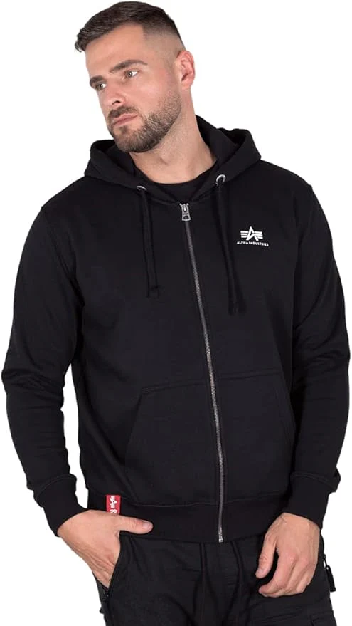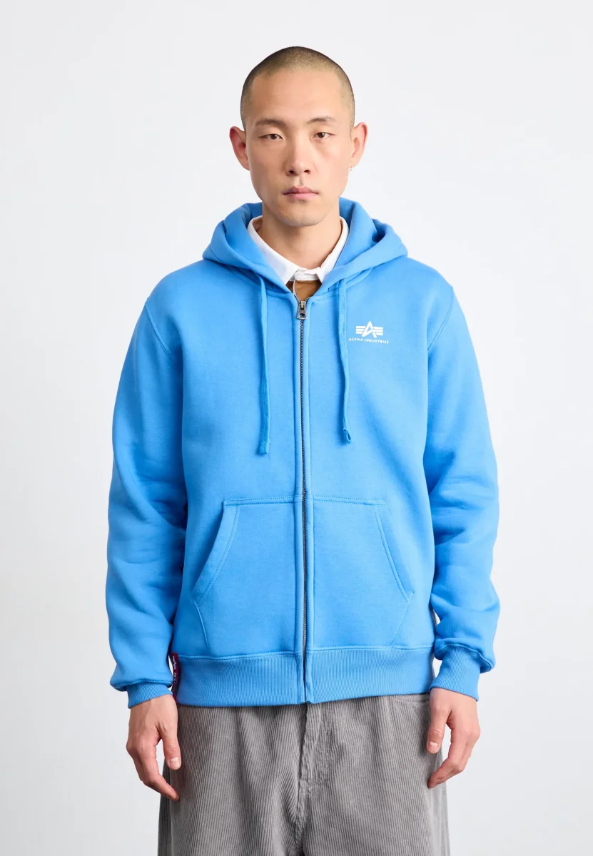 Alpha-industries Basic Zip Hoody Small Logo. De hoody is gemaakt van 80%/20% Katoen/polyester en is voorzien van een doorlopende rits en een klein logo op delinkerborst.