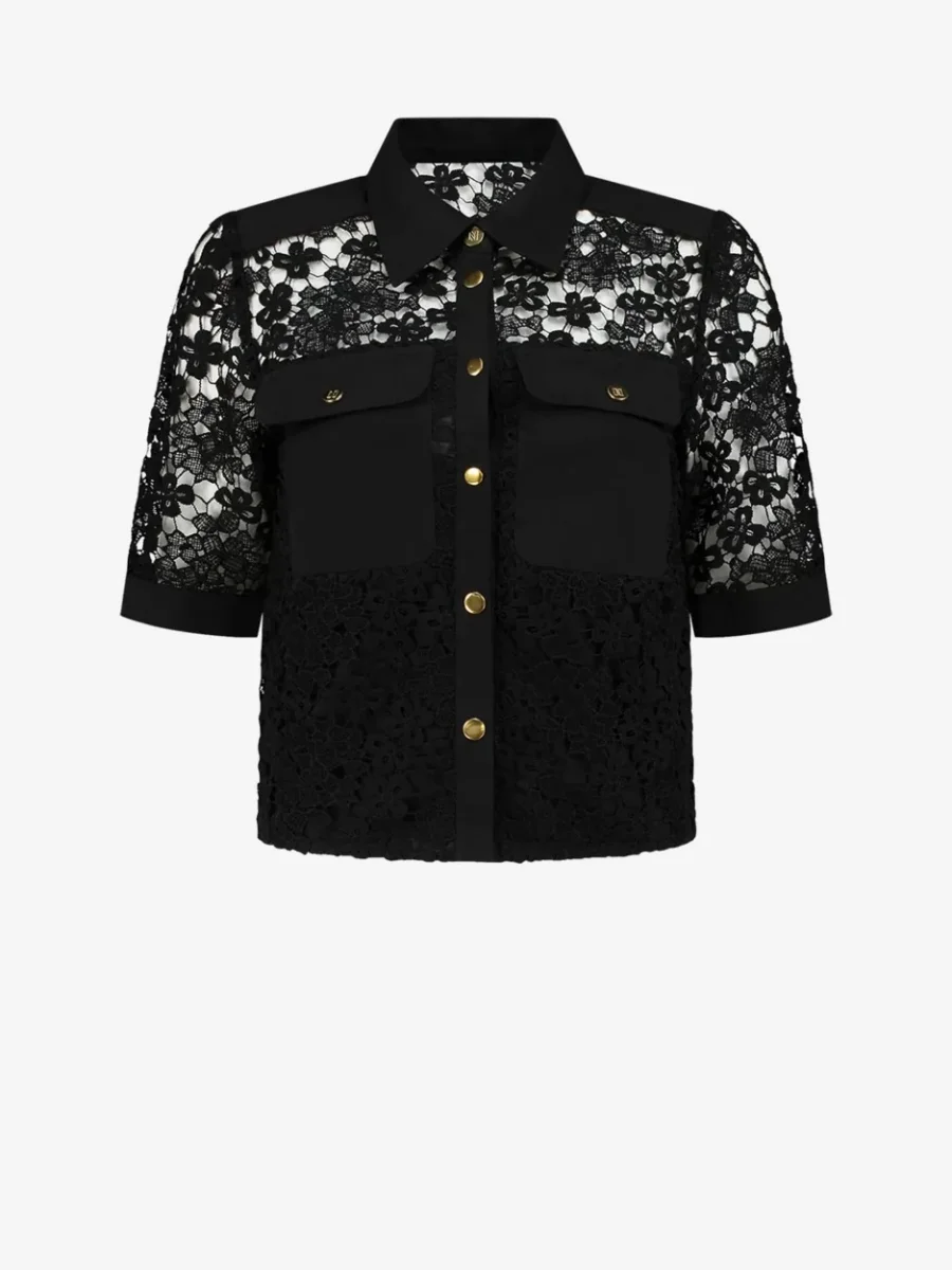 Deze prachtige zwarte blouse van Nikkie is de perfecte aanvulling op jouw kledingkast. Met zijn kanten details en korte mouwen is deze blouse ideaal voor de warmere dagen. De blouse heeft een overhemdkraag, gouden drukknopen en twee klepzakken op de voorkant, waardoor hij een stoere maar toch vrouwelijke uitstraling heeft. De blouse is gemaakt van 100% gerecycled polyester, wat niet alleen goed is voor het milieu maar ook zorgt voor een comfortabele pasvorm. Combineer deze blouse met een mooie rok of met een stoere jeans voor de perfecte outfit. Shop nu deze Nikkie blouse in onze kledingwebshop Nummerzestien en steel de show met deze must-have item van dit seizoen!