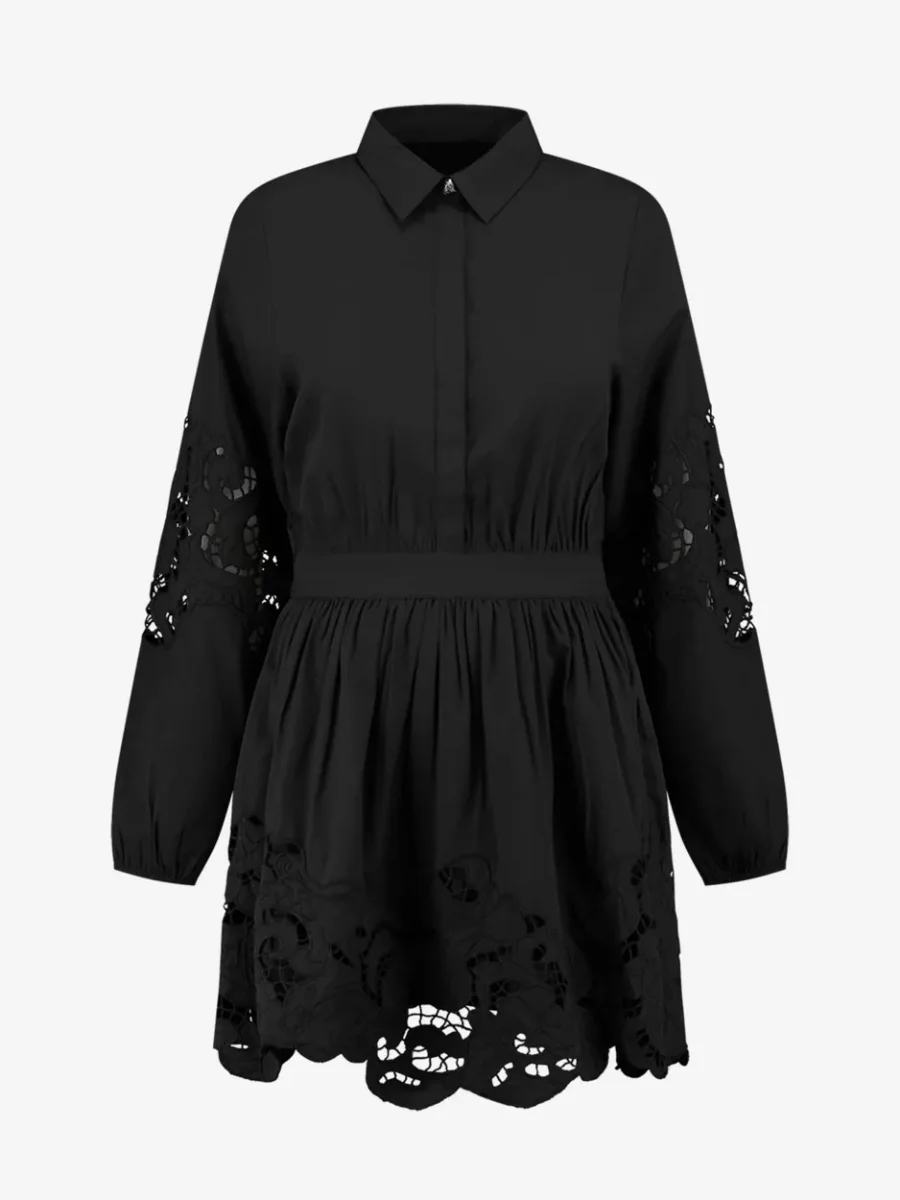 Deze zwarte jurk van het merk Nikkie is een onmisbaar item in de garderobe van elke modebewuste vrouw. De getailleerde pasvorm zorgt ervoor dat jouw vrouwelijke vormen prachtig worden geaccentueerd, terwijl de wijde lange mouwen een speels en elegant effect geven. Het kraagje is voorzien van een decoratieve N-knoop, wat de jurk een subtiel en stijlvol detail geeft. De kanten details bij de mouwen en rok zorgen voor een romantische touch en geven de jurk een chique uitstraling. Gemaakt van 100% gerecycled polyester, draagt deze jurk niet alleen bij aan jouw trendy look, maar ook aan een duurzamere mode-industrie. Combineer de jurk met een paar mooie hakken en je bent klaar om te stralen op elke gelegenheid. Bestel nu deze prachtige zwarte Nikkie jurk bij Nummerzestien en voeg een tijdloos en fashionable item toe aan jouw collectie.