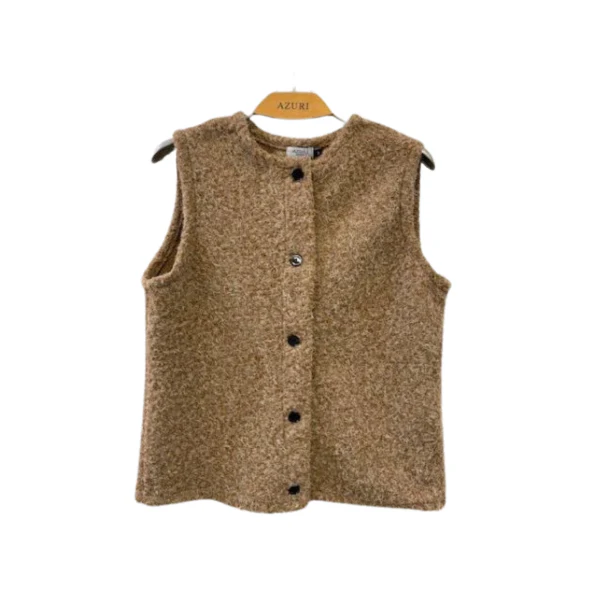 Ervaar de zachte elegantie van dit bouclé-chilletje met ronde hals van Azuri. Het vestje heeft een subtiel gemêleerde structuur, is heerlijk soepel en voorzien van stijlvolle knopen aan de voorzijde. Perfect voor een verzorgde, vrouwelijke look — zowel netjes als casual te dragen.