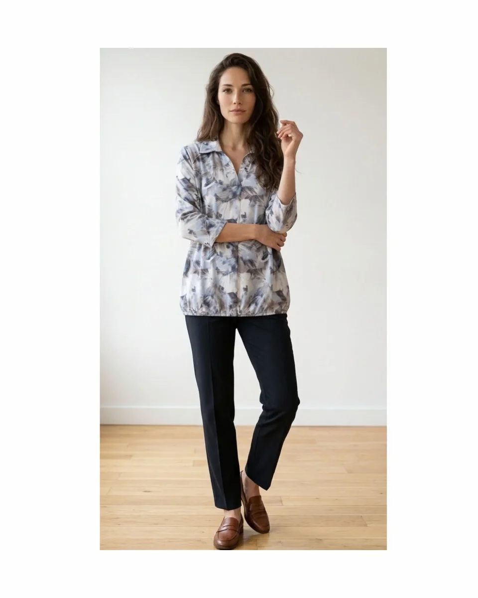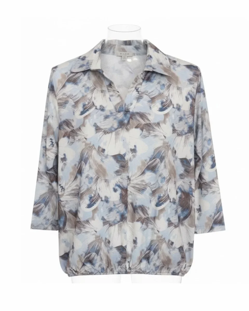 Comfortabel polo-shirt met een kleine V-hals en een elegante polokraag. De dunne elastische band aan de onderzijde zorgt voor een licht blousend effect, waardoor het shirt mooi valt en eenvoudig in lengte te verstellen is. De soepele stof draagt heerlijk en maakt dit model geschikt voor vrijwel ieder lichaamstype.
