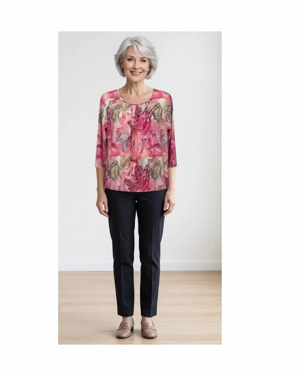 Een comfortabel T-shirt met driekwart mouwen en een mooie ronde halslijn met een subtiel O-detail net onder de hals. De soepele viscose mix voelt zacht aan op de huid en draagt heerlijk licht. Dankzij het elastiek in de zoom kunt u het shirt mooi laten bloezen of juist iets langer dragen over de heup.