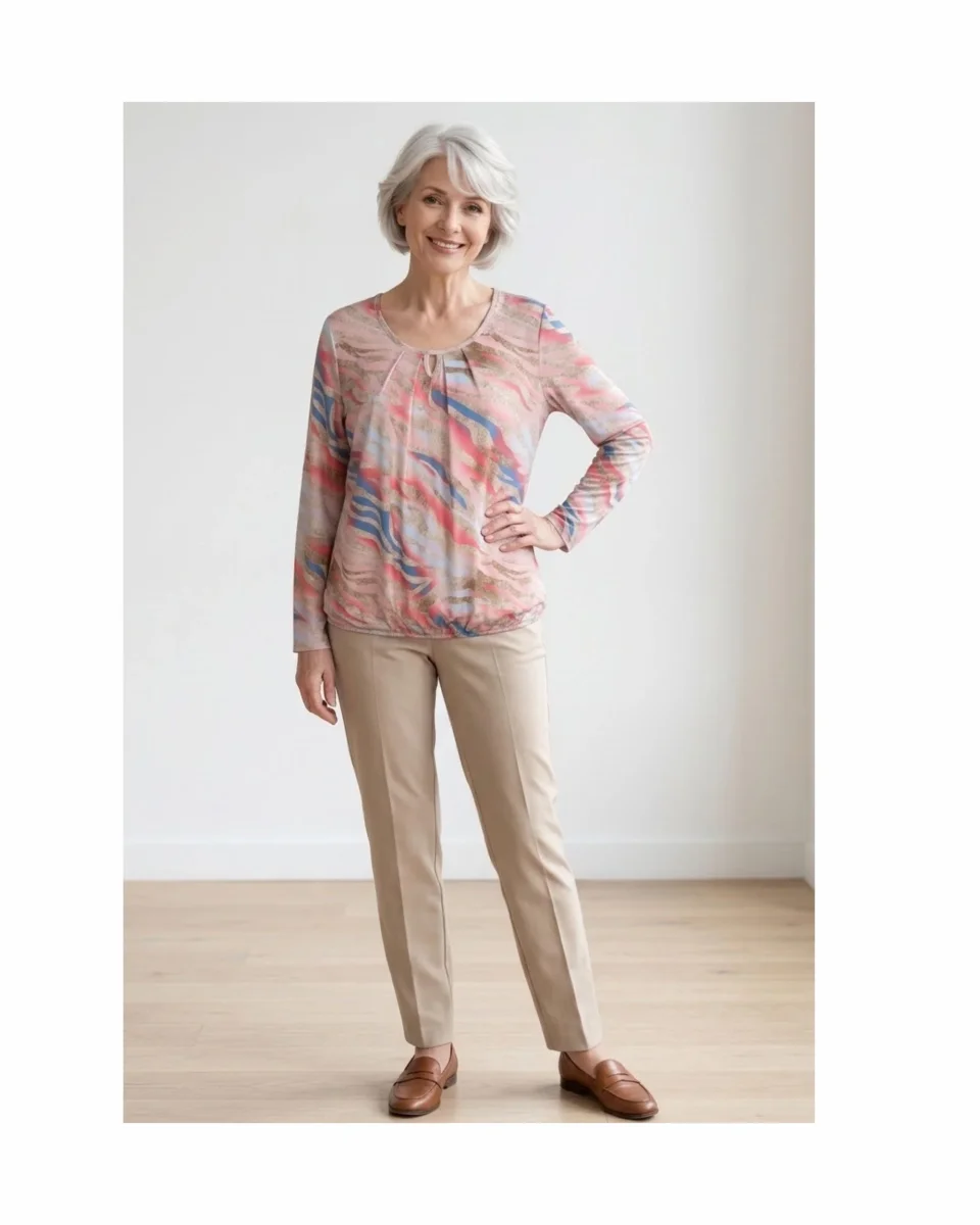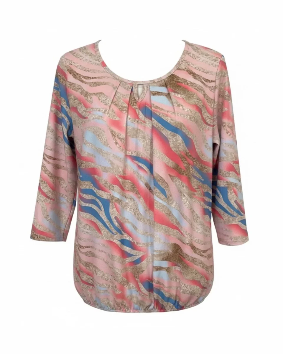 Een comfortabel T-shirt met driekwart mouwen en een mooie ronde halslijn met een subtiel O-detail net onder de hals. De soepele viscose mix voelt zacht aan op de huid en draagt heerlijk licht. Dankzij het elastiek in de zoom kunt u het shirt mooi laten bloezen of juist iets langer dragen over de heup.