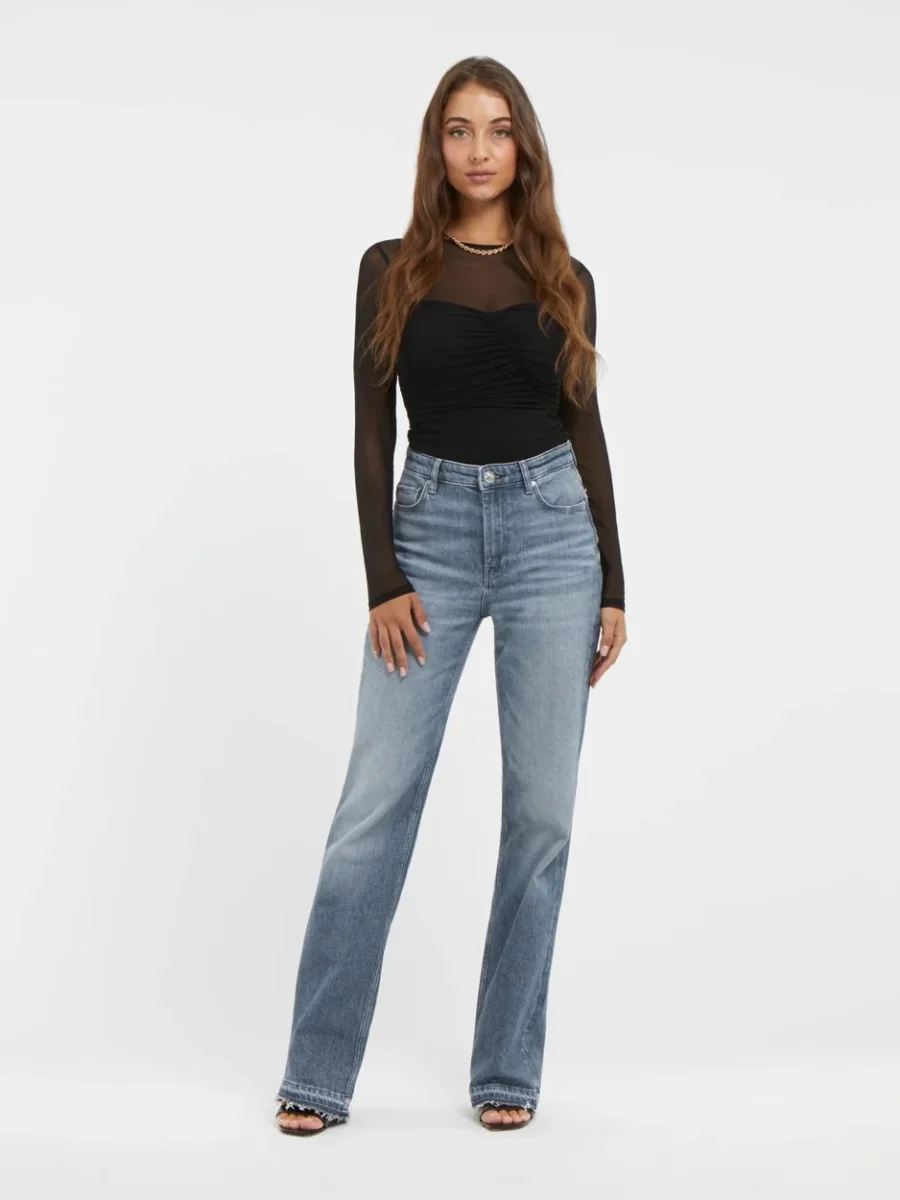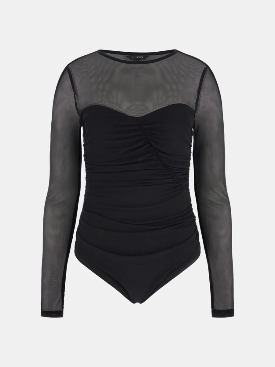 Deze zwarte body van Guess Dames is de perfecte aanvulling op je garderobe! Het model Brianne heeft een stijlvolle drukknoopsluiting aan de onderzijde en lange transparante mouwen. De ronde hals en gedrapeerde details aan de voorzijde geven deze body een elegante touch. Dankzij de strakke pasvorm accentueert deze body je vrouwelijke vormen op een subtiele manier. Gemaakt van 92% polyamide en 8% elasthan, met een voering van 92% polyester en 8% elasthan, voelt deze body heerlijk zacht aan op de huid en biedt ultiem draagcomfort. Stijlvol, comfortabel en een echte must-have voor elke fashionista! Bestel nu deze Guess Body en straal in elke outfit!
