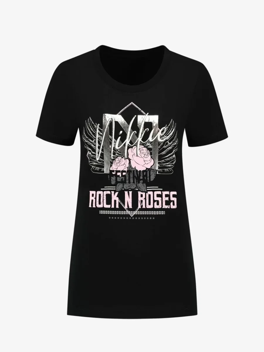 Het zwart kleurige T-shirt k/m dames van het merk Nikkie is een must-have item voor elke moderne vrouw. Gemaakt van 100% katoen, is dit T-shirt niet alleen stijlvol, maar ook comfortabel om te dragen. De perfecte pasvorm zorgt voor een flatterende look, terwijl het zachte katoen zorgt voor een ademend gevoel. Of je nu een casual dagje uit gaat of een avondje uit met vrienden, dit T-shirt is de perfecte keuze. De opvallende zwarte kleur geeft elke outfit een stoere en edgy uitstraling. Aarzel niet langer en voeg dit trendy T-shirt toe aan je garderobe. Bestel nu bij Nummerzestien en geniet van de hoogwaardige kwaliteit van Nikkie!