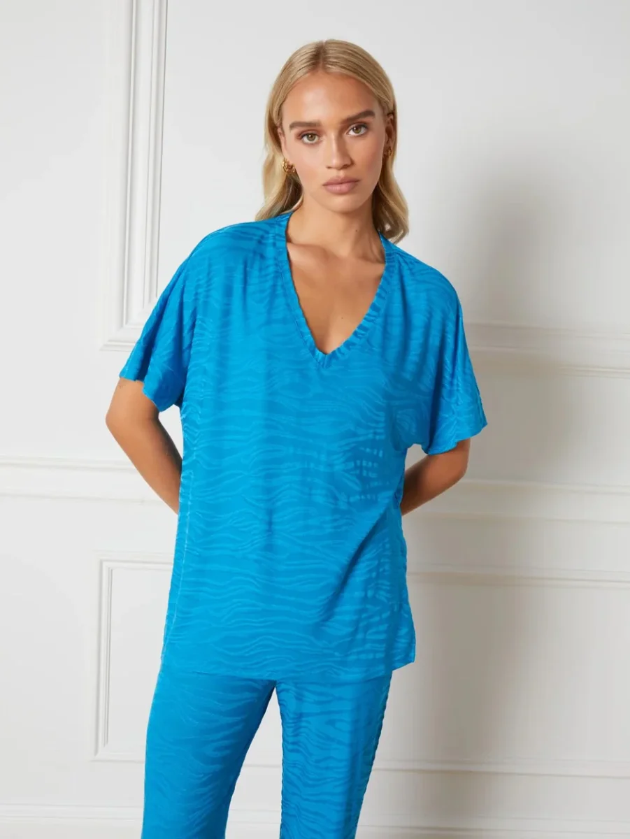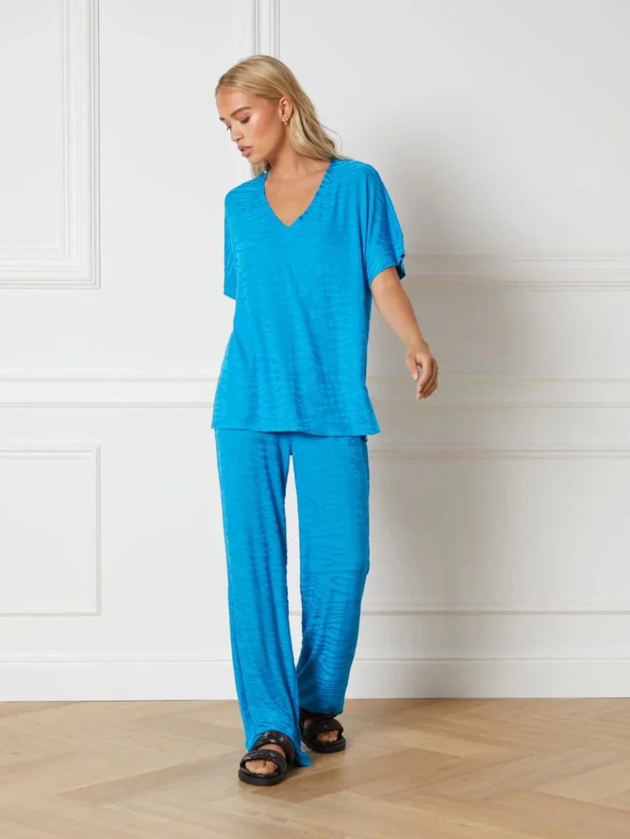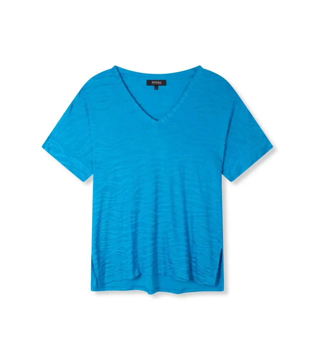 Geef je outfit een frisse touch met dit prachtige kobaltkleurige t-shirt van Refined Department. Het Taylor t-shirt is speciaal ontworpen voor dames en heeft korte mouwen voor een casual look. Het shirt is gemaakt van een rijke jacquard jersey stof en heeft een opvallende glanzende zebrastructuur over de hele stof. De oversized pasvorm geeft dit t-shirt een trendy en comfortabele uitstraling. Het materiaal van dit shirt bestaat uit 60% viscose, 35% polyester en 5% elastaan wat zorgt voor een fijne rekbaarheid en optimale pasvorm. Met dit t-shirt ben je klaar om in stijl de deur uit te gaan!