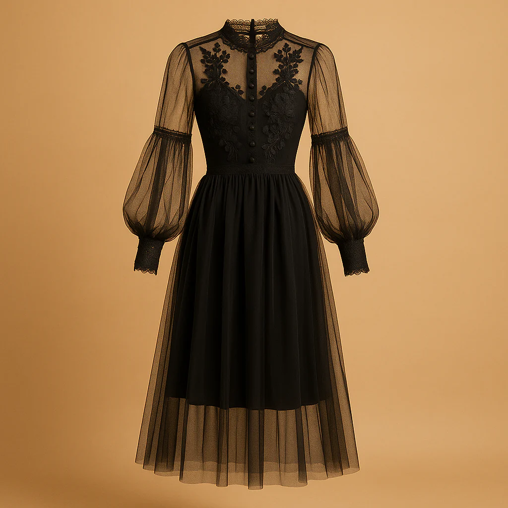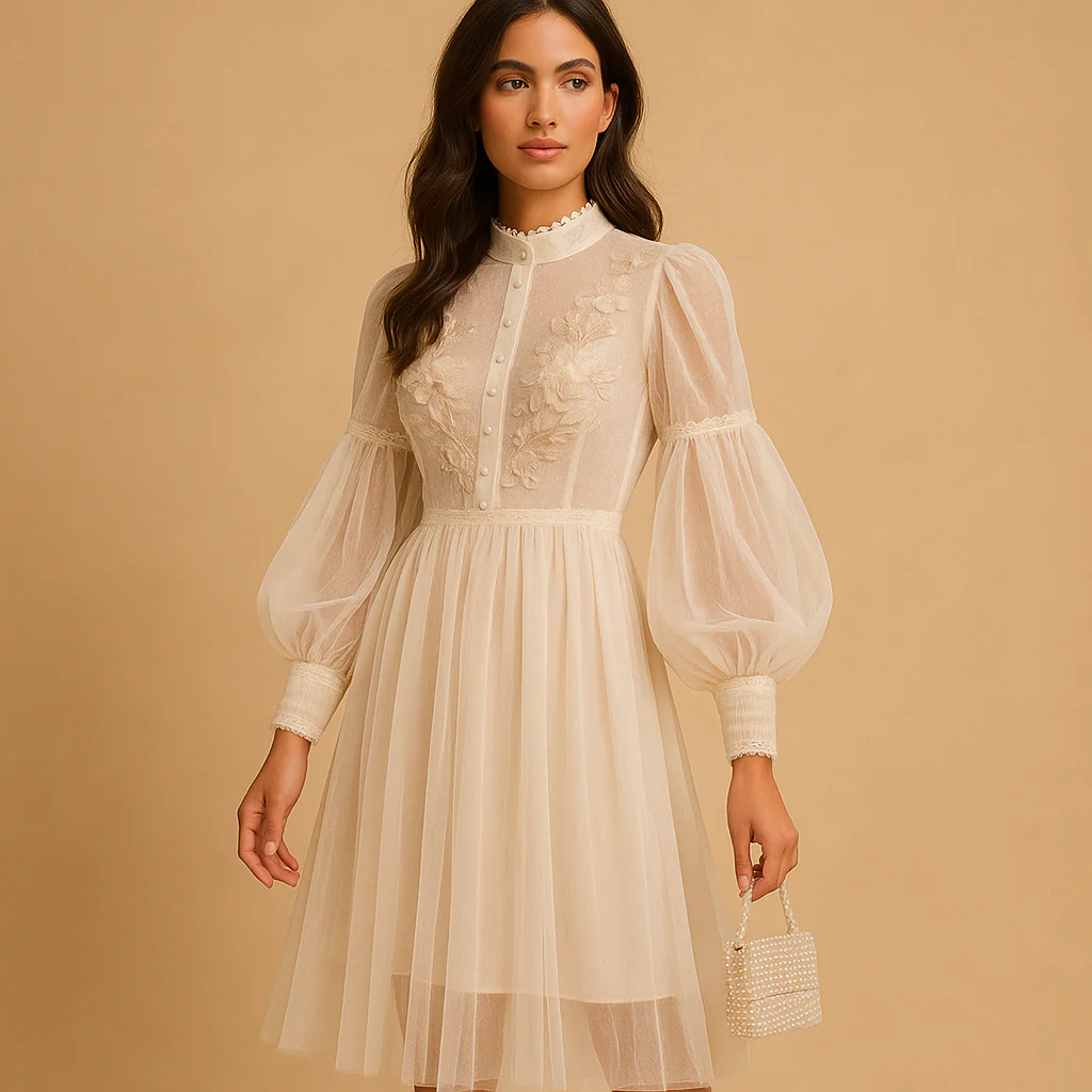 • Design: Opstaande kraag en elegante lantaarnmouwen