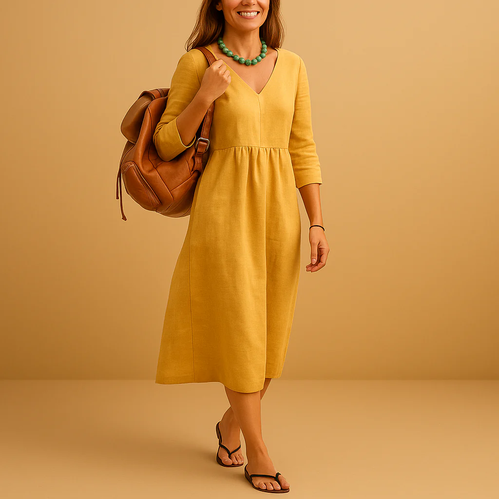 Deze stijlvolle en verfijnde midi-jurk combineert elegantie met comfort. Het hoog getailleerde ontwerp zorgt voor een flatterend silhouet, terwijl de V-hals een subtiele, vrouwelijke uitstraling geeft. De halflange mouwen bieden de perfecte balans tussen bescheidenheid en stijl. Ideaal voor zowel formele als casual gelegenheden, deze jurk laat je stralen bij elke gelegenheid.