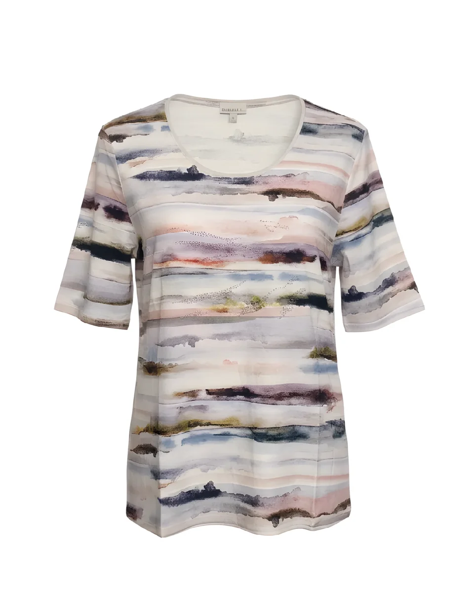 Dit Gabriella K. T-shirt is een comfortabel en stijlvol model met een mooie ronde hals en een prettige korte mouw die valt tot net op de elleboog. Het subtiele aquarel streepdessin in de breedte geeft het shirt een zachte uitstraling, afgewerkt met een klein en verfijnd strass steentje.