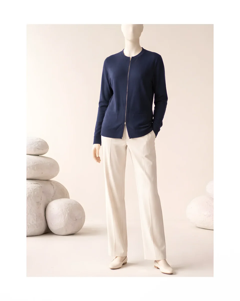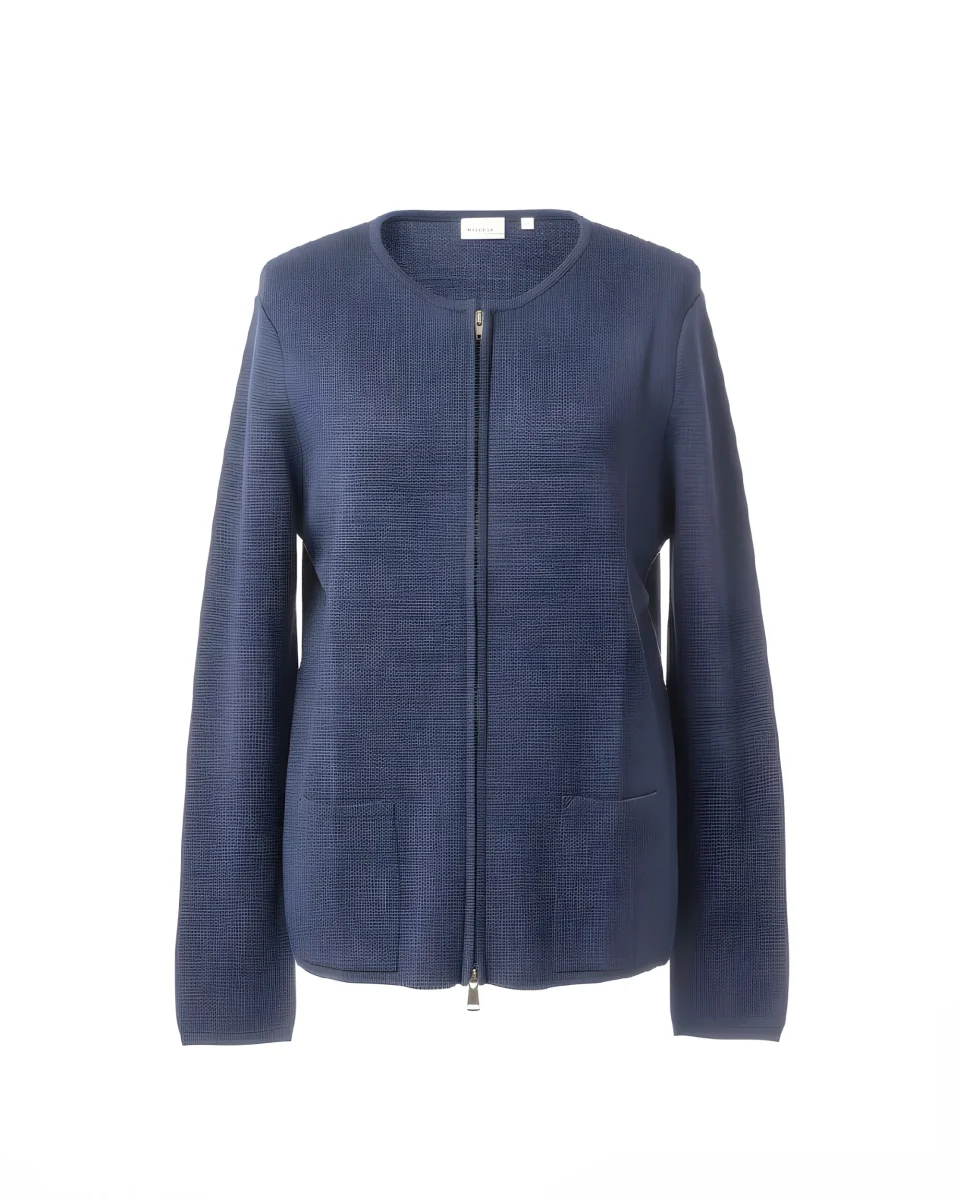 Productomschrijving: Dit vest is een comfortabel en stijlvol model met een ronde hals, lange mouwen en een praktische ritssluiting. Het vest heeft twee zakken op het voorpand en is uitgevoerd in een frisse indigo blauwe kleur, ideaal voor het voorjaar.