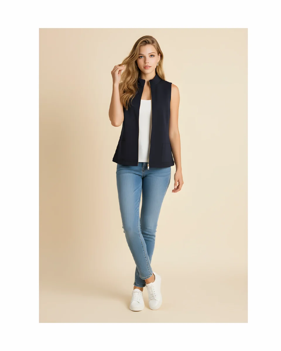 Stijlvol gilet van Gabriëlle K. met een subtiele ribbel- en reliefstructuur. Het model heeft een opstaande kraag, een rits en twee praktische zakken aan de voorzijde – comfortabel én verzorgd voor elke dag.