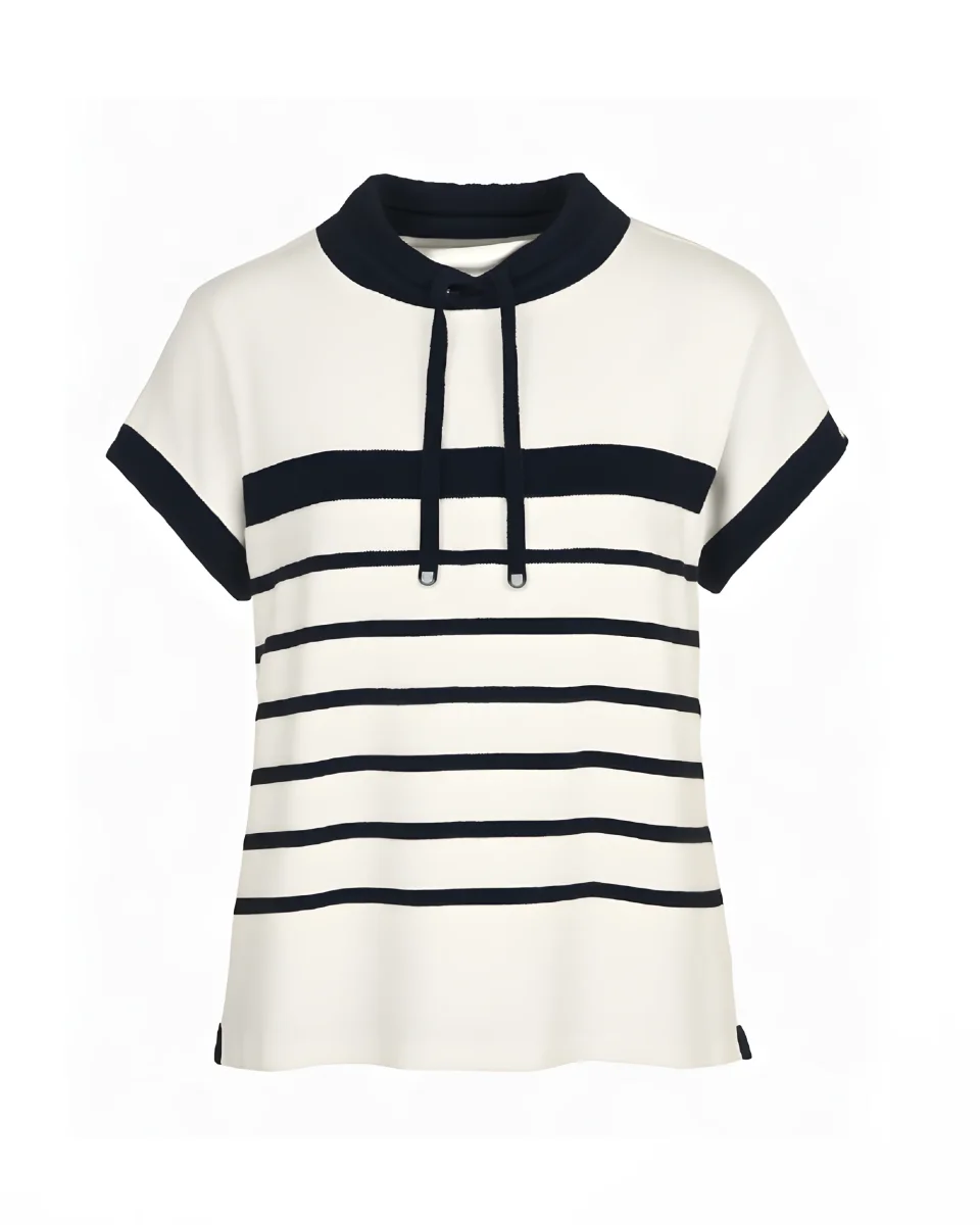 Dit sportieve T-shirt van Gabrielle K. heeft een frisse, maritieme uitstraling met een off-white basis en een brede donkerblauwe streep. De licht opstaande boord met koord en veter details, gecombineerd met donkerblauwe accenten bij de mouwen, geven het shirt een stoere maar verzorgde look. Gemaakt van een fijne, soepele stofkwaliteit en uitgevoerd in een licht oversized model.