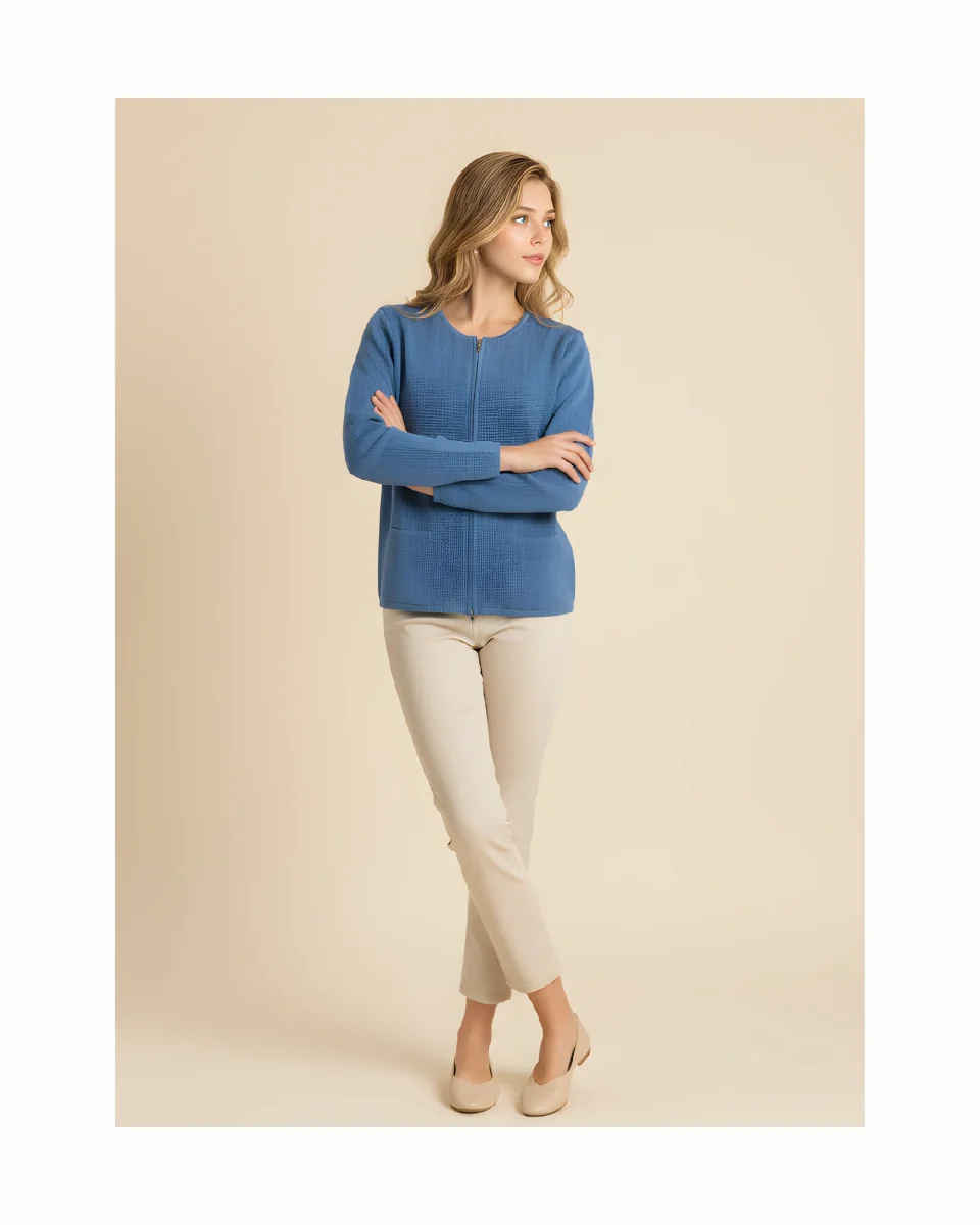Productomschrijving: Dit vest is een comfortabel en stijlvol model met een ronde hals, lange mouwen en een praktische ritssluiting. Het vest heeft twee zakken op het voorpand en is uitgevoerd in een frisse indigo blauwe kleur, ideaal voor het voorjaar.