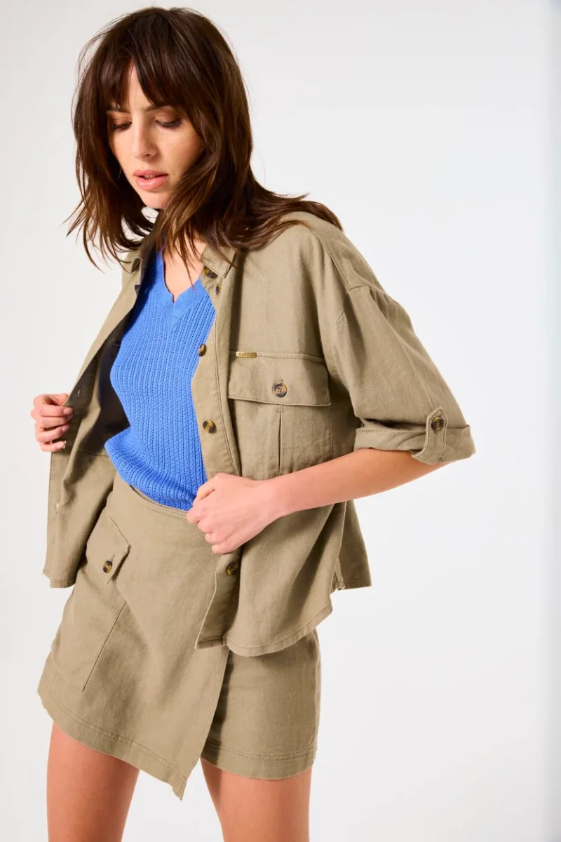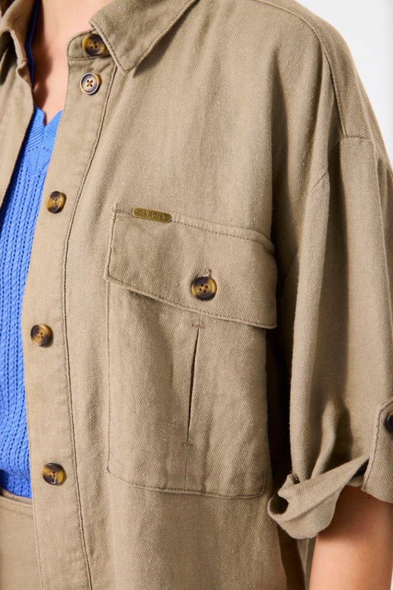 Het kaki kleurenpalet geeft deze blouse een stoere en toch ook elegante uitstraling. De blouse heeft korte mouwen en een klassieke kraag, waardoor het zowel geschikt is voor formele als informele gelegenheden. Combineer het met een paar jeans voor een casual look of met een pantalon voor een chique uitstraling. De blouse heeft een subtiele knoopsluiting aan de voorkant en een klein Garcia logo op de borst.