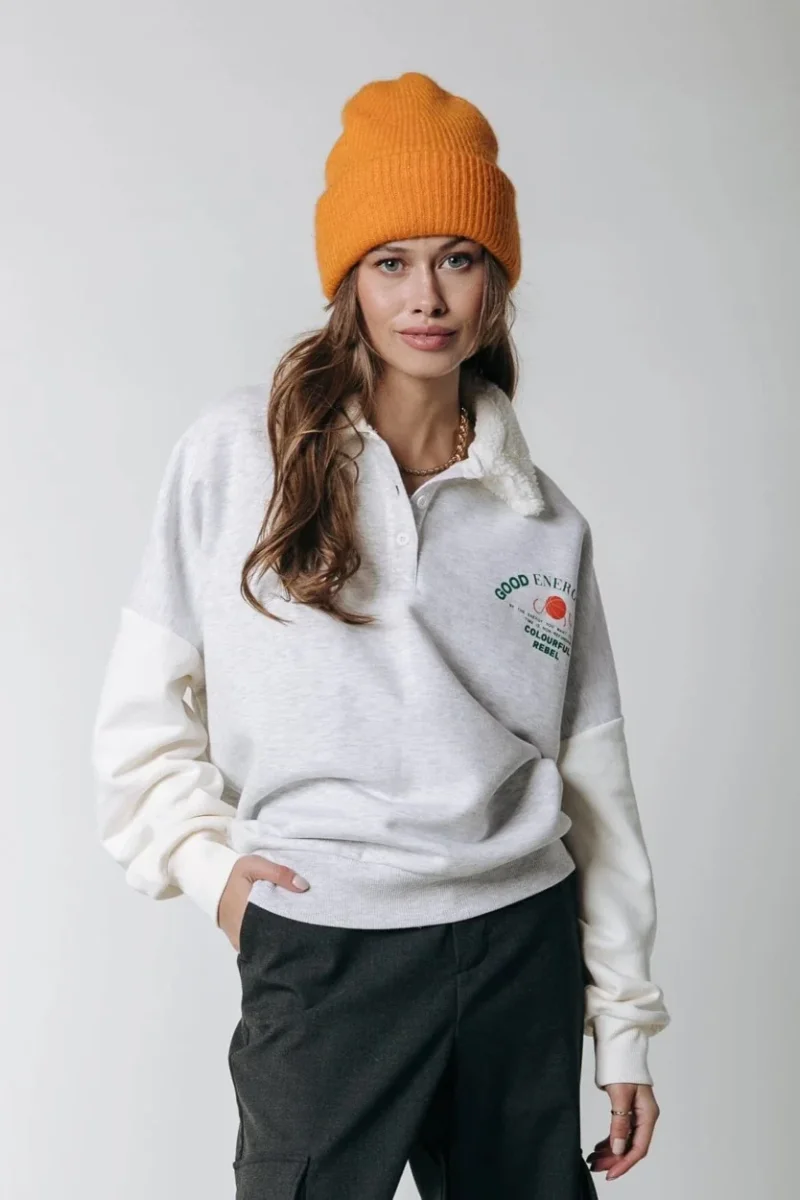 Deze grijze melee sweater voor dames van het merk Colourful Rebel is de perfecte aanvulling op jouw kledingkast. De trui heeft een speels uiterlijk door de fluffy kraag en de 3-knoopssluiting aan de voorzijde. Het model Good Energy straalt positiviteit en energie uit, wat zeker terug te zien is in de kleine print op de borst en de grote 07 print aan de achterzijde.