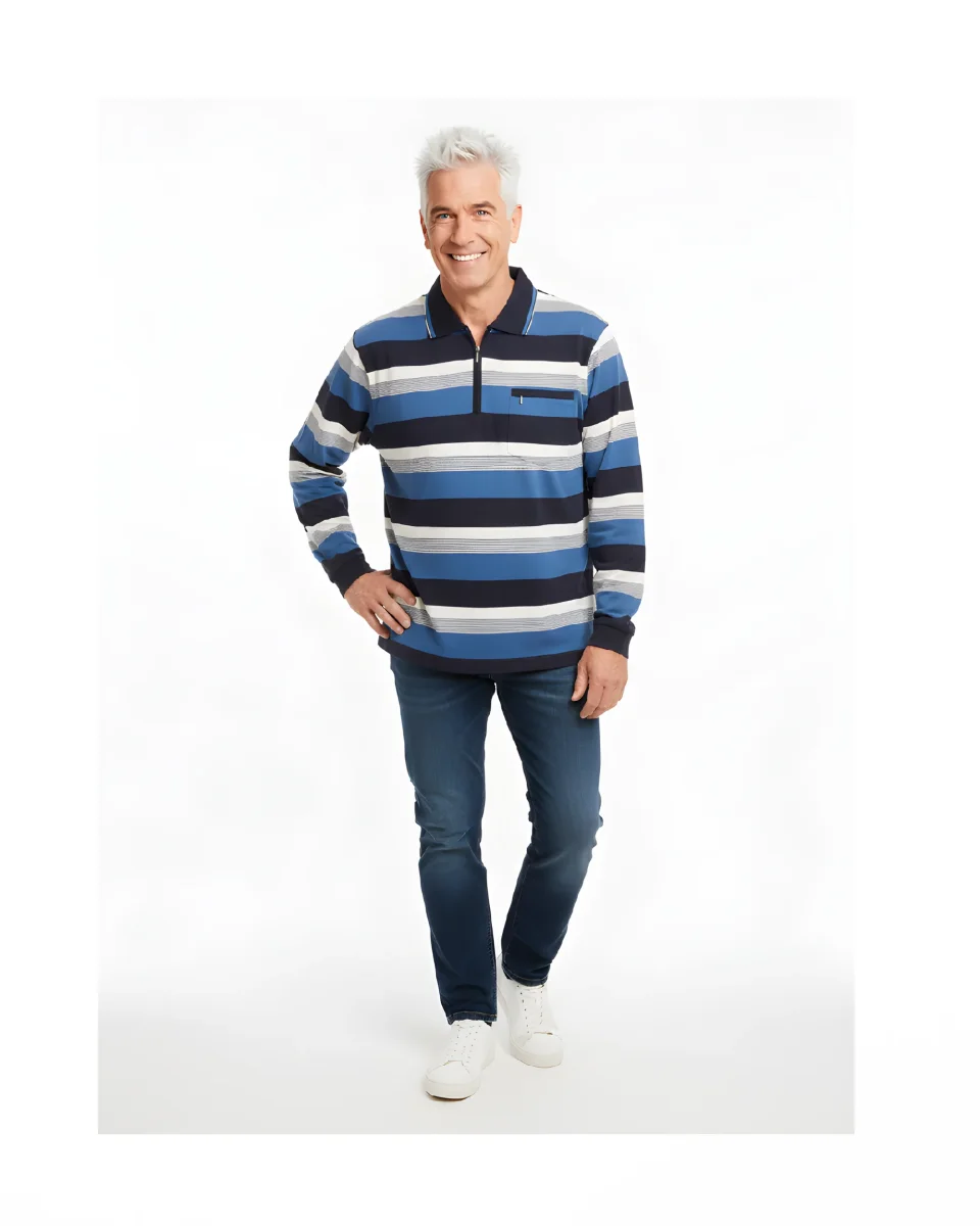Dit heren poloshirt heeft een donkerblauwe ondertoon met een subtiel streepdessin en een sportieve, verzorgde uitstraling. De polokraag is afgewerkt met een bijpassend streepje en een rits aan de bovenzijde. Extra praktisch is het afsluitbare borstzakje met rits, ideaal voor dagelijks gebruik. Shirt valt ruim!