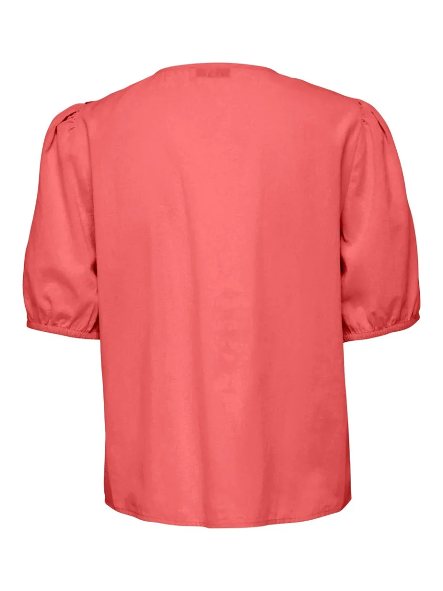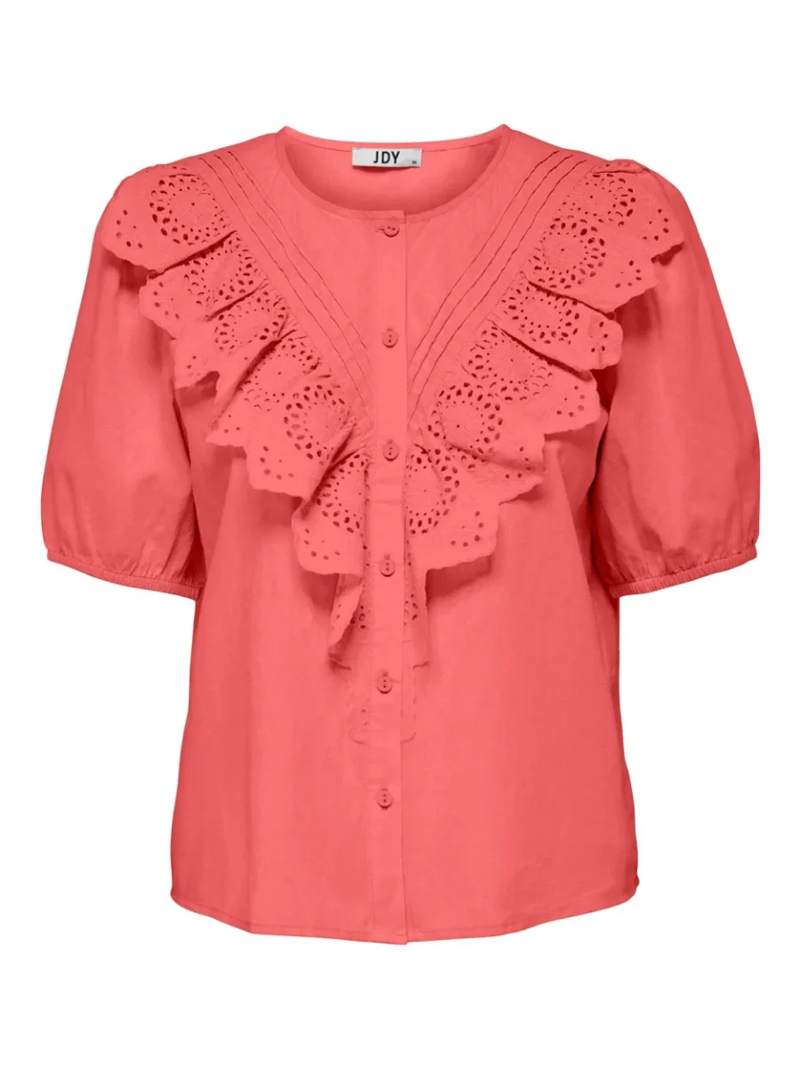 Het ziet er naar uit dat de trendkleur van dit seizoen koraal rood is en het merk Jacqueline de Yong heeft zich hierbij aangesloten met hun prachtige blouse. Deze blouse is perfect voor elke gelegenheid, van een dag op kantoor tot een avondje uit met vriendinnen. De blouse heeft een klassieke ronde hals en 2/4 mouwen, waardoor het een tijdloze toevoeging is aan je garderobe.