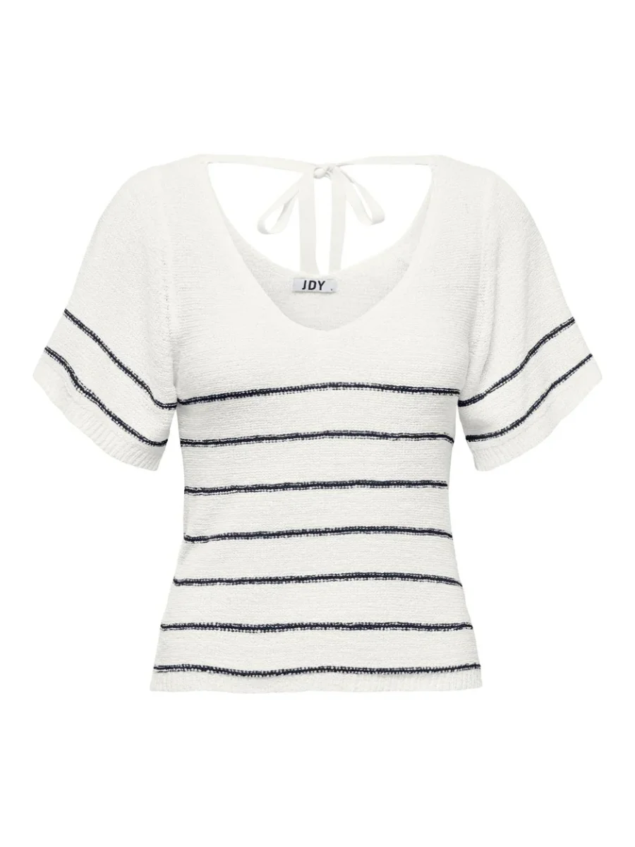 Deze prachtige top van Jacqueline de Yong is de perfecte aanvulling op jouw kledingcollectie! De top, genaamd Desha, heeft een wit dessin met een diepblauwe kleur, wat zorgt voor een frisse en stijlvolle uitstraling. Deze top heeft korte mouwen en een elegante V-hals, waardoor het een veelzijdig kledingstuk is dat voor verschillende gelegenheden gedragen kan worden. Het gebreide materiaal is gemaakt van 55% acryl en 45% nylon, waardoor het zacht en comfortabel aanvoelt op de huid.