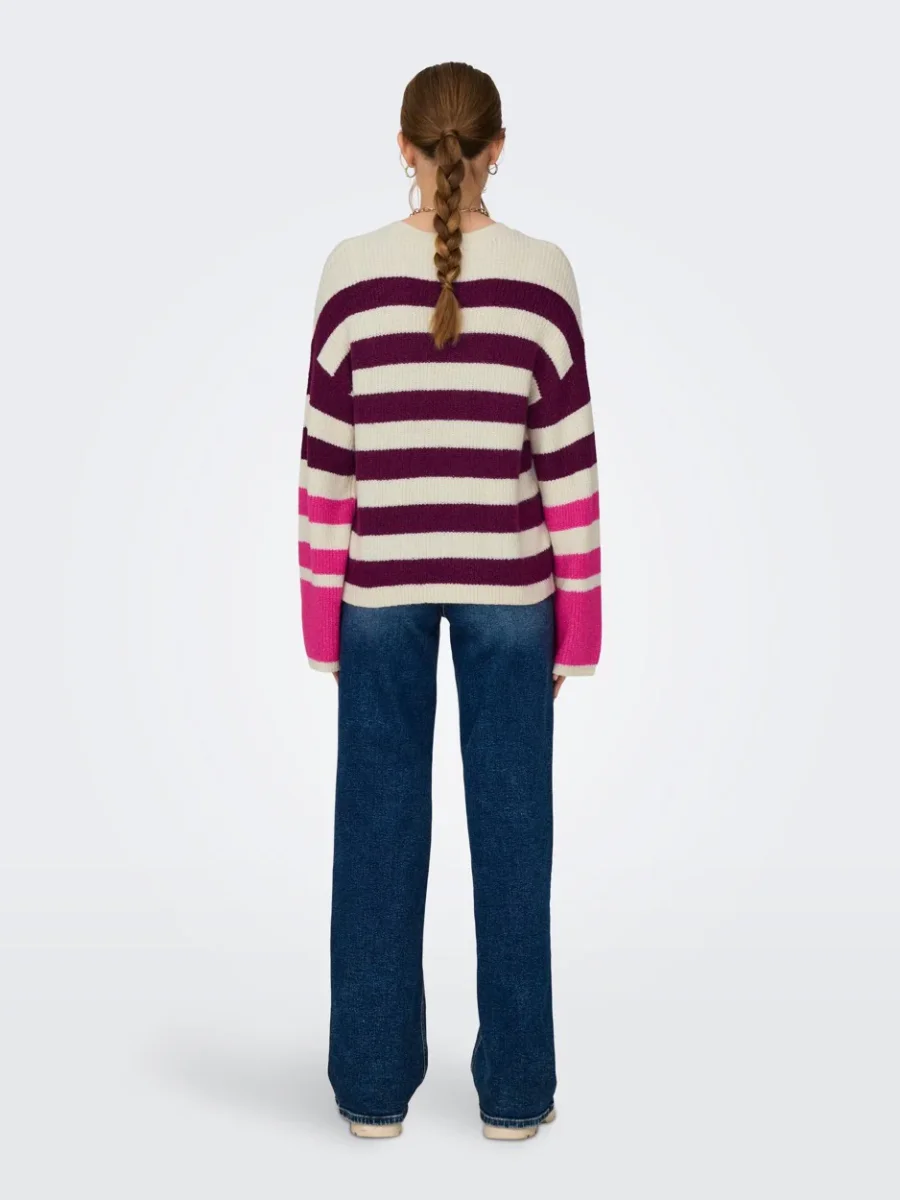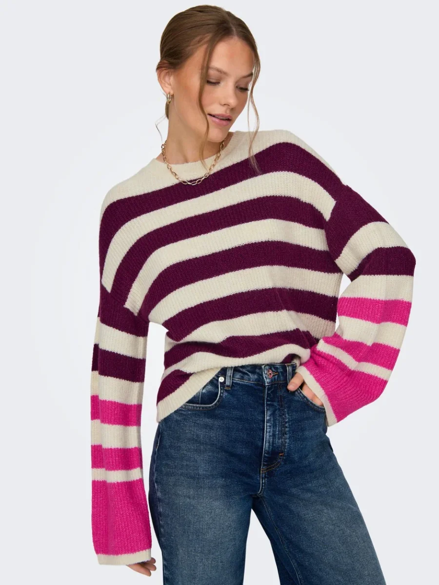 Deze paars dessin trui van ONLY is het perfecte kledingstuk voor de trendy en modebewuste dame. De JDY Drea sweater heeft een ronde hals en is voorzien van een gebreide structuur. Het all-over streep dessin geeft de trui een speelse en opvallende uitstraling. Op de mouwen is een felle roze streep aangebracht, wat zorgt voor een leuk contrast. De verlaagde schoudernaden geven de trui een comfortabele en nonchalante pasvorm.