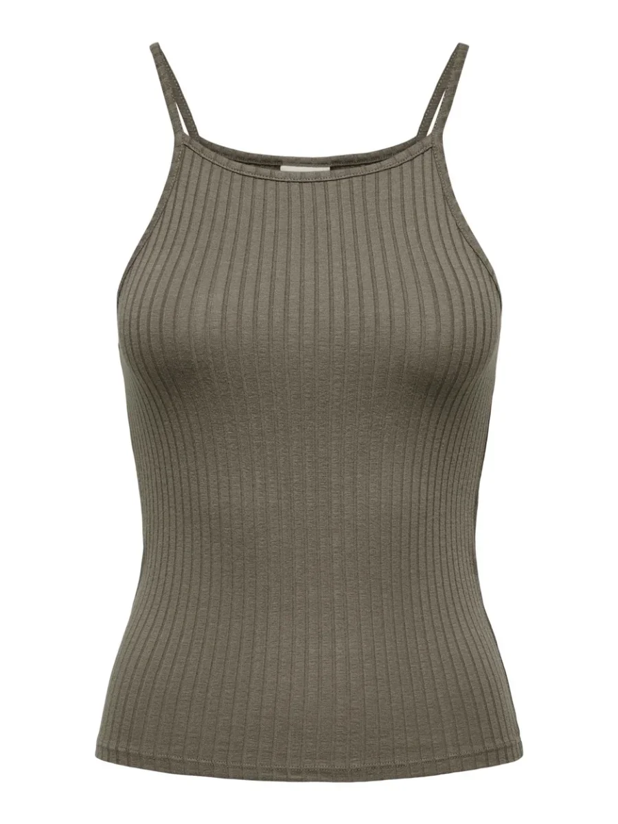 De geribbelde stof zorgt voor een speelse look en de mooie taupe kleur is een tijdloze toevoeging aan je kledingcollectie. De spaghetti bandjes en de hoge hals geven deze top een vrouwelijke uitstraling.