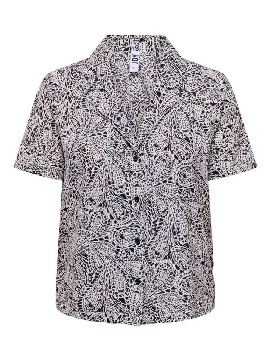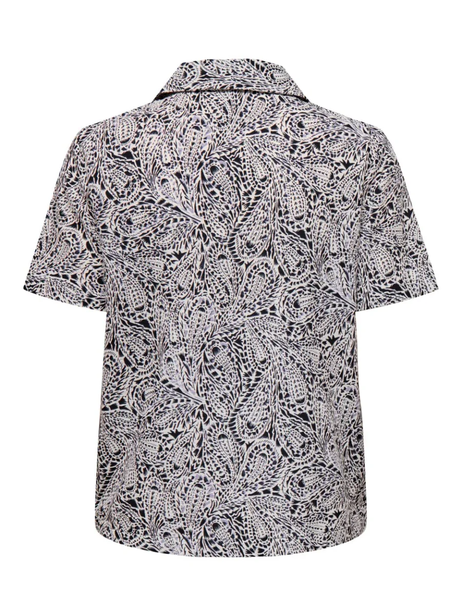 De blouse heeft een flatterende regular fit en is voorzien van korte mouwen en een stijlvolle overhemdkraag/v-hals, waardoor het zowel geschikt is voor een zakelijke gelegenheid als voor een casual dagje uit. Het zwart dessin geeft de blouse een tijdloze en klassieke uitstraling, waardoor het gemakkelijk te combineren is met verschillende kledingstukken en accessoires.