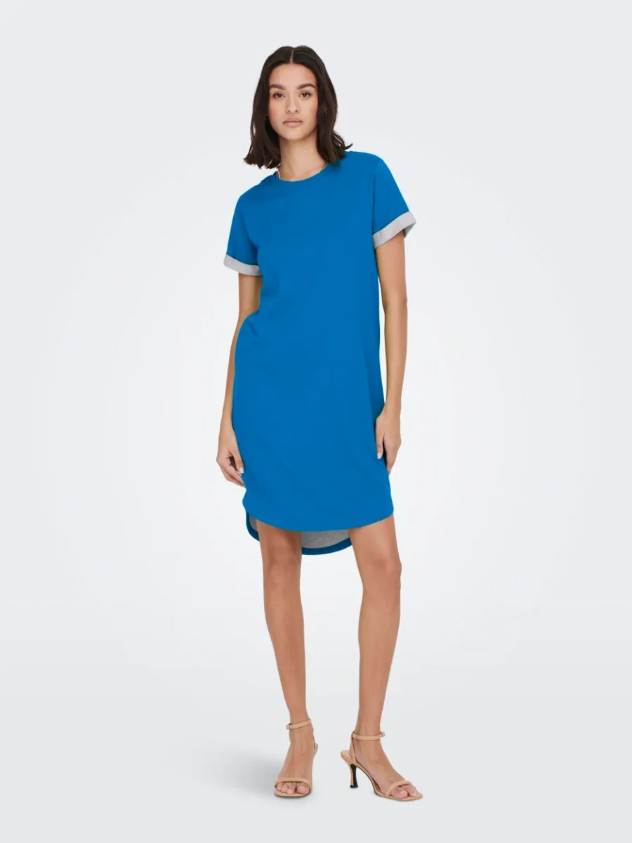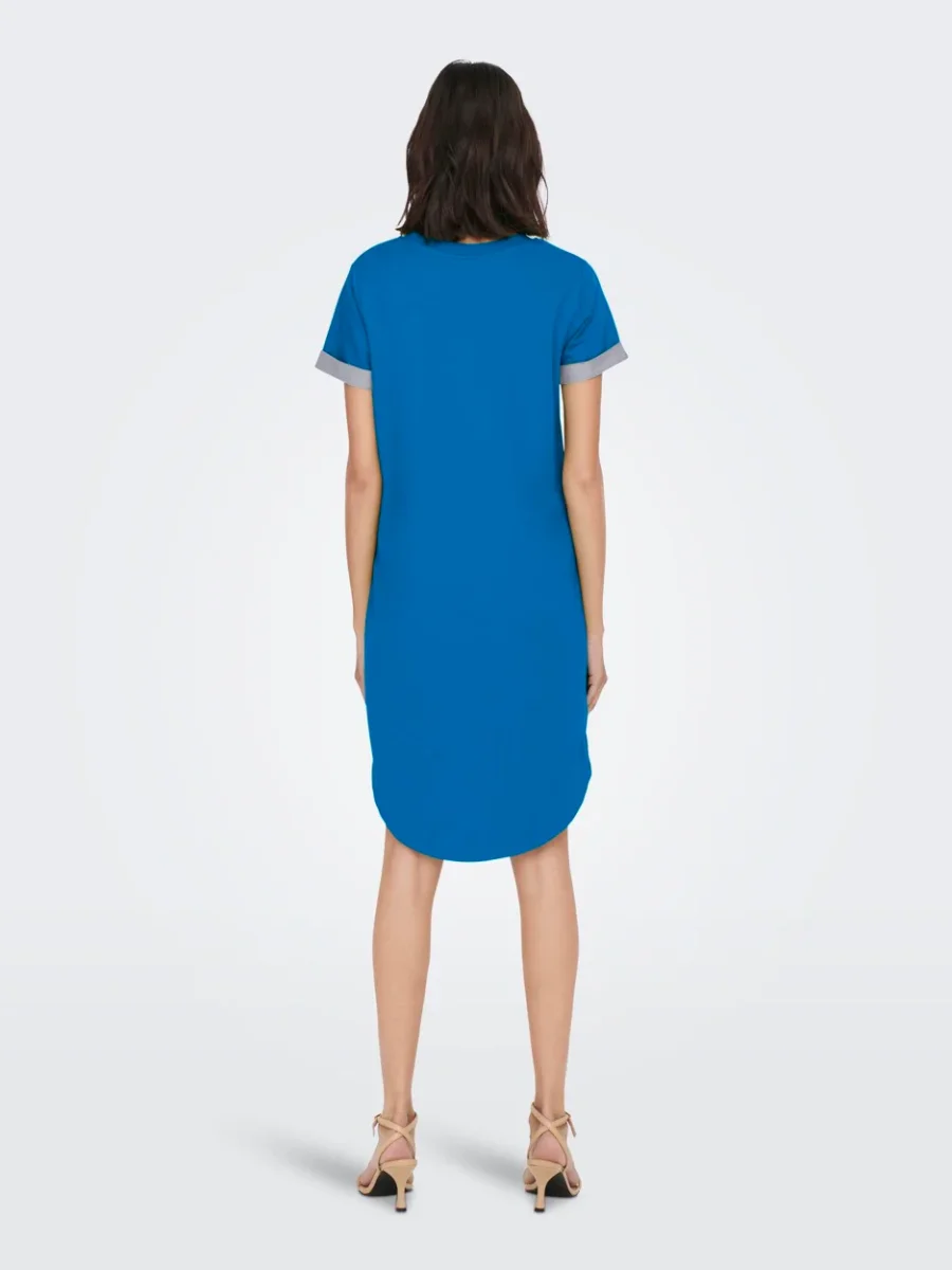 Deze korte damesjurk heeft een ronde hals en korte mouwen die zijn omgeslagen voor een extra speels effect. De jurk komt tot op de knie en heeft aan de achterkant een iets langere lengte dan aan de voorkant. Dit geeft de jurk een eigentijdse en trendy uitstraling.