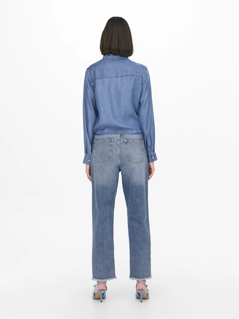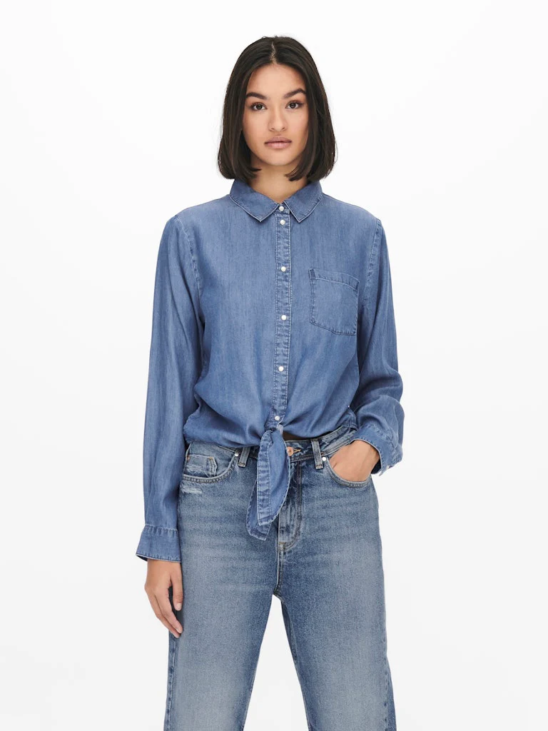 Deze stijlvolle blouse/lange mouwen van Jacqueline de Yong is de perfecte toevoeging aan jouw kledingkast. De blouse is uitgevoerd in een tijdloze blue denim kleur en gemaakt van 100% lyocell. Hierdoor voelt de blouse super zacht en licht aan op de huid. Het materiaal zorgt ook voor een lichte glans, wat zorgt voor een luxe uitstraling. De blouse heeft een kraag, knoopsluiting en borstzakken voor een klassieke touch. Draag de blouse met een stoere spijkerbroek en sneakers voor een casual look, of met een zwarte broek en hakken voor een meer geklede uitstraling. Shop nu deze must-have blouse en geef jouw outfit een fashionable upgrade!