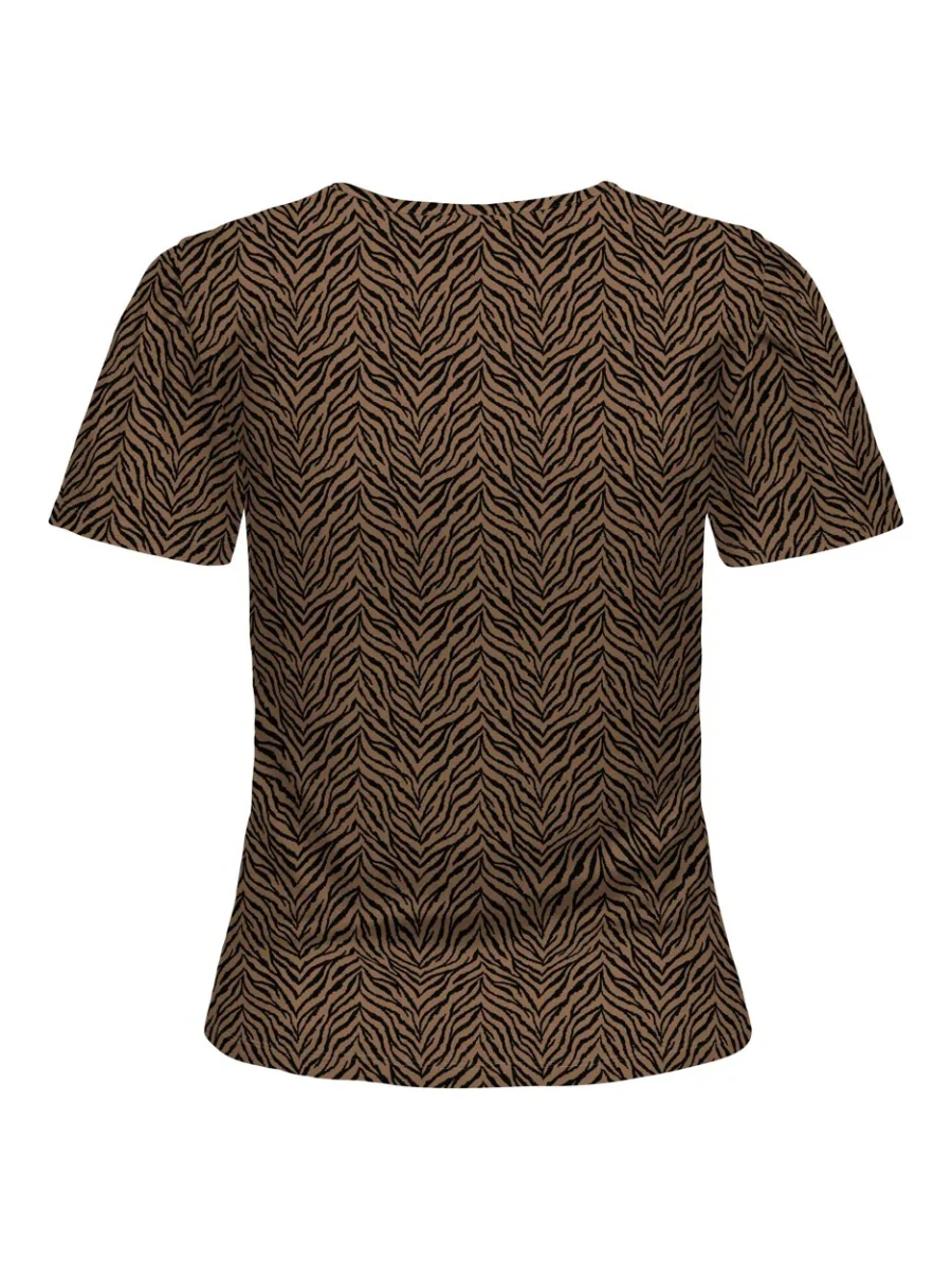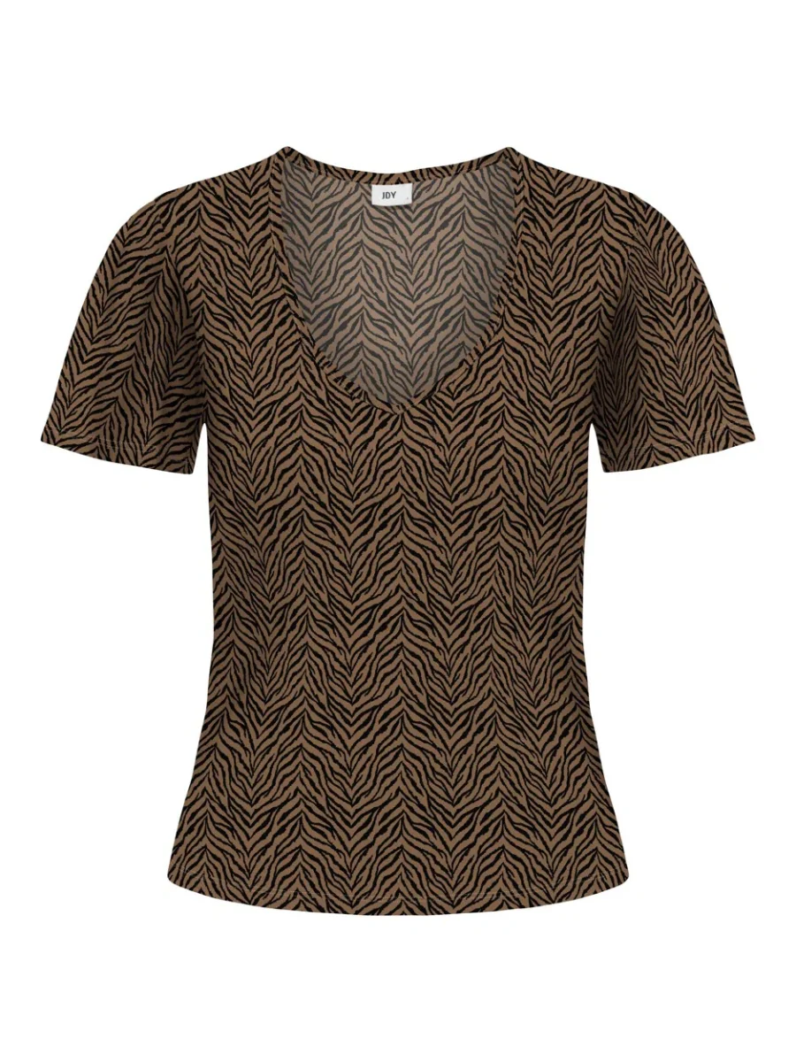 Deze stijlvolle bruin dessin top is perfect voor dames die op zoek zijn naar een trendy, maar toch comfortabel kledingstuk. De top is afkomstig van het merk Jacqueline de Yong en draagt de naam jdy t-shirt model kamilla. Met korte mouwen en een v-hals is dit shirt ideaal voor de warmere dagen en kan het eenvoudig gecombineerd worden met verschillende outfits.
