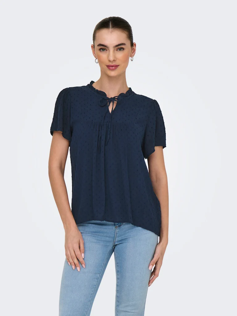 Deze prachtige navy gekleurde top van het gerenommeerde merk Jacqueline de Yong is een must-have voor elke kledingkast. De top is gemaakt van 100% viscose waardoor hij een heerlijk zachte en soepele stof heeft. Door de korte mouwen is deze top perfect voor de zomer en dankzij de losse pasvorm zit hij ook nog eens heerlijk comfortabel. De top heeft een stijlvolle ronde hals en is gemakkelijk te combineren met zowel een jeans als een rok. Met deze top creëer je in een handomdraai een casual en toch trendy look. Bestel nu deze trendy navy top van Jacqueline de Yong en steel de show!