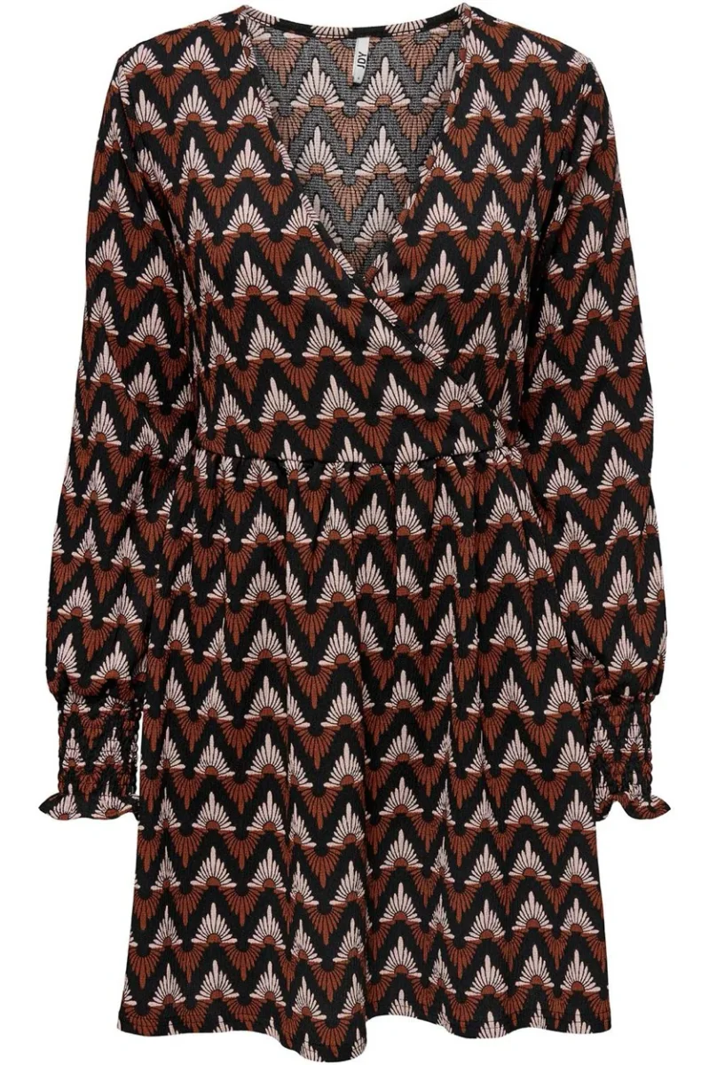 De jurk valt tot net boven de knie, waardoor je benen mooi worden geaccentueerd. De V-hals en overslag aan de bovenkant zorgen voor een subtiel en flatterend decolleté. De elastische tailleband geeft de jurk een comfortabele en vrouwelijke pasvorm, terwijl de elastische mouwbandjes de mouwen een speelse touch geven.