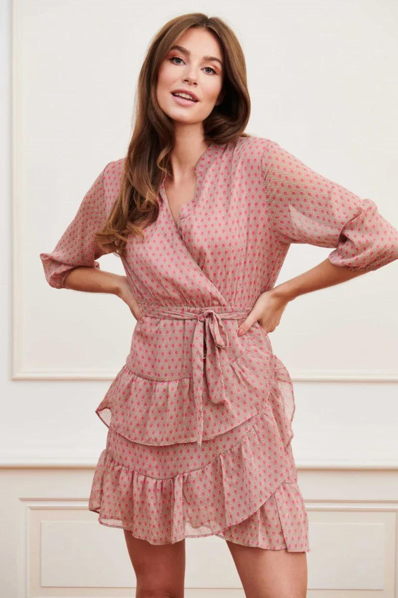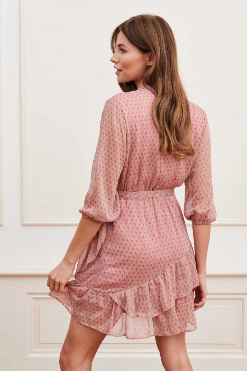 De faux-wrap jurk heeft mooie driekwart mouwen en elastiek in de mouwuiteinden, wat zorgt voor een speelse en vrouwelijke look. Aan de onderkant van de jurk vind je twee rufflebanen, wat zorgt voor een opvallend en sierlijk effect. De jurk is gemaakt van 100% polyester en heeft een zachte onderjurk voor extra comfort.