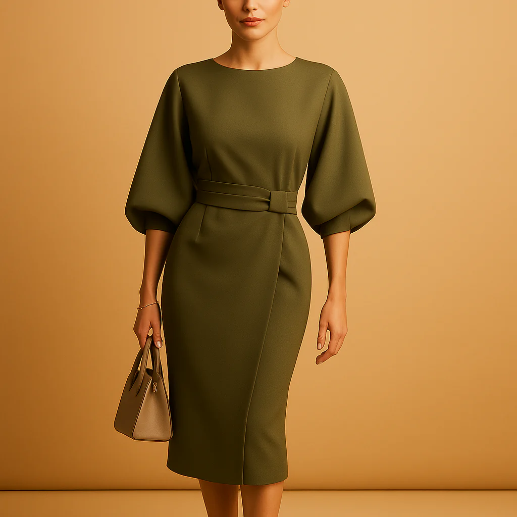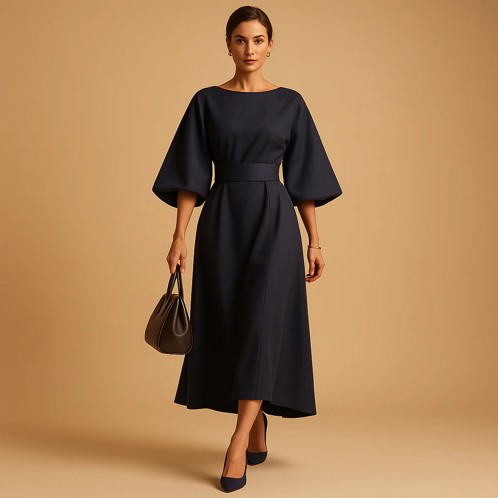Omarm tijdloze elegantie met Yente, een midi-jurk met A-lijn en strikceintuur voor dames die zorgt voor een vrouwelijk silhouet met een gestructureerde pasvorm. De wijde mouwen voegen een vleugje flair toe, terwijl de ceintuur in de taille je figuur mooi benadrukt. Perfect voor een dag op kantoor, een chic diner of een semi-formele gelegenheid.