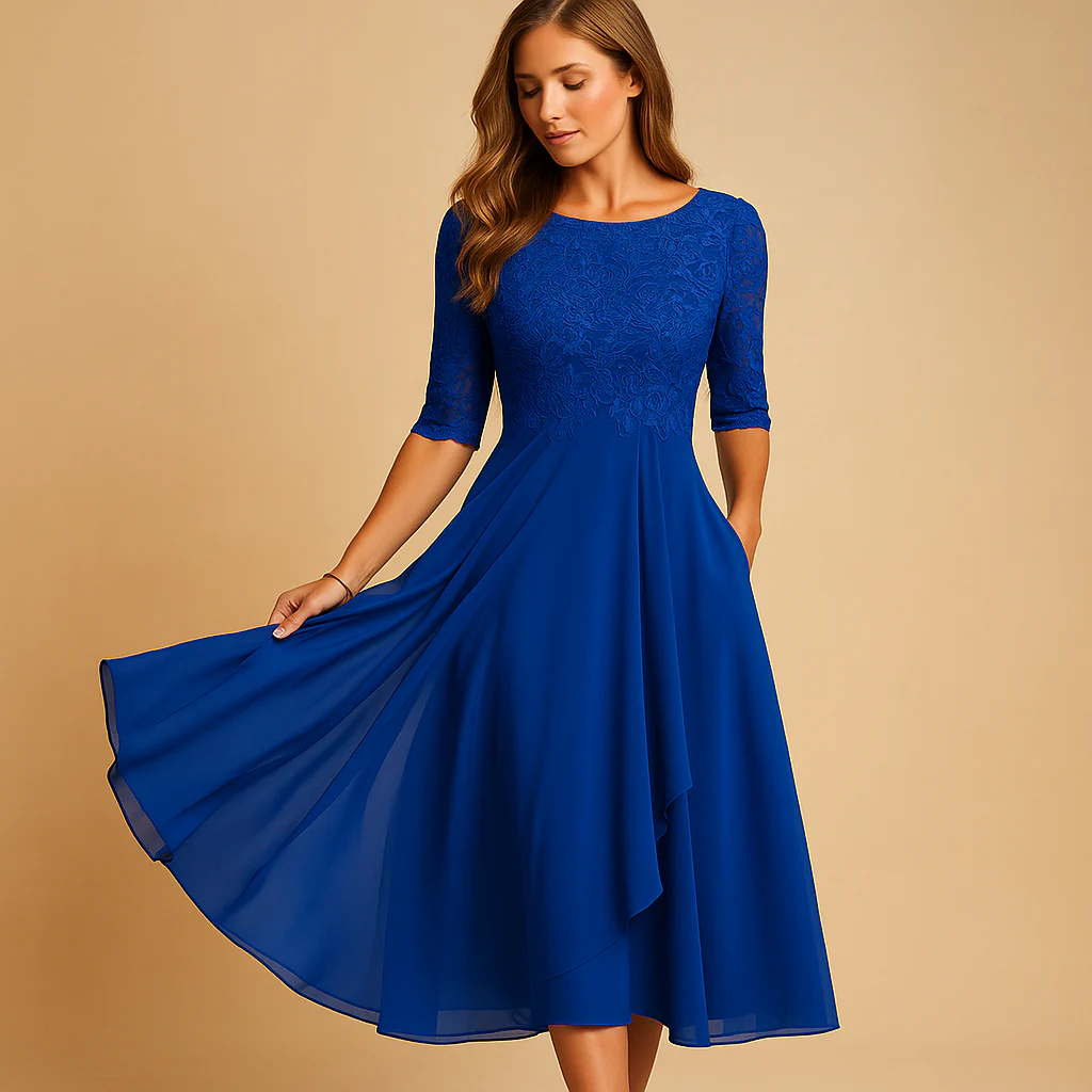 Voeg verfijning toe aan je garderobe met Livia, een midi-jurk met kanten top en asymmetrische rok voor dames. De elbooglange mouwen en gelaagde rok zorgen voor een stijlvolle, vrouwelijke uitstraling die ideaal is voor cocktailfeestjes, speciale gelegenheden of een chique zomerdag. Het comfortabele ontwerp garandeert bewegingsvrijheid zonder in te boeten op elegantie.