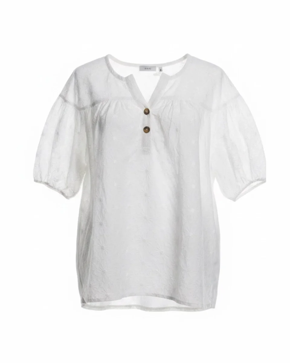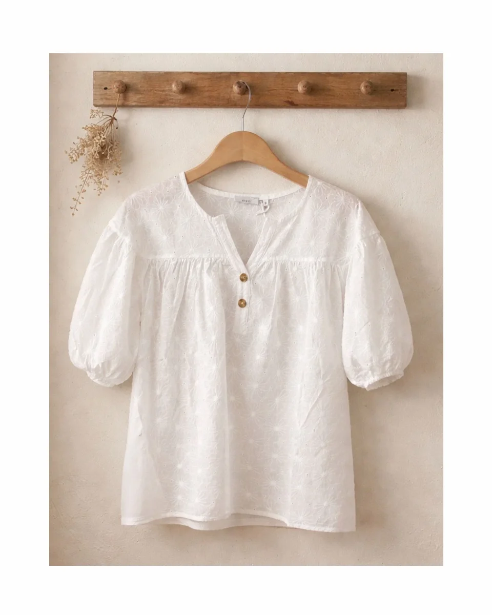 Dit charmante tuniekje van MXO is uitgevoerd in wit katoen met een verfijnde broderie afwerking. Het model heeft een ronde hals met een klein v splitje en twee knoopjes, wat zorgt voor een zachte, vrouwelijke uitstraling. De korte pofmouwen zijn afgewerkt met een elastiekje en geven het blouseje een speels en luchtig effect.