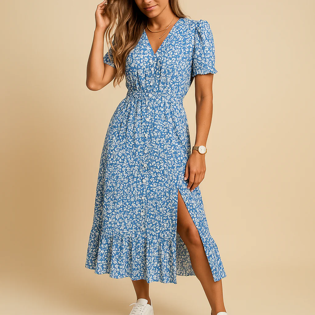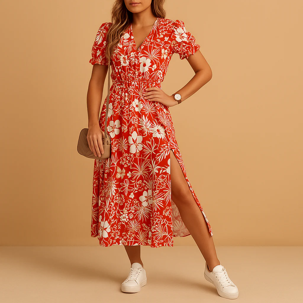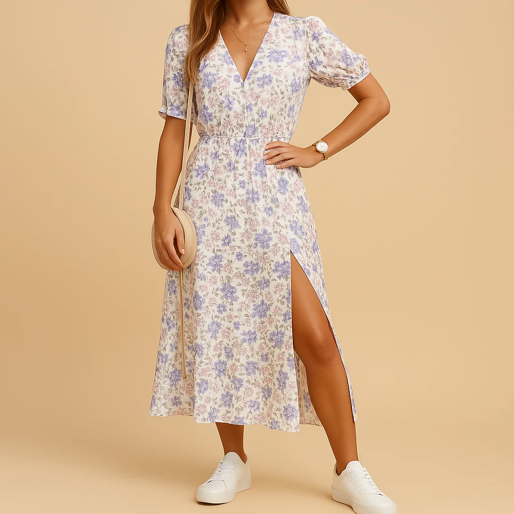 Vier de zomer in stijl met Nina, een luchtige en elegante maxi-jurk voor dames met een vrouwelijke V-hals en lange rok met split. Deze jurk biedt maximaal comfort dankzij de ademende pasvorm en is perfect voor strandvakanties, tuinfeestjes of een casual zomerdag. De trendy print en keuze uit zes levendige kleuren maken Nina een echte blikvanger in jouw garderobe.