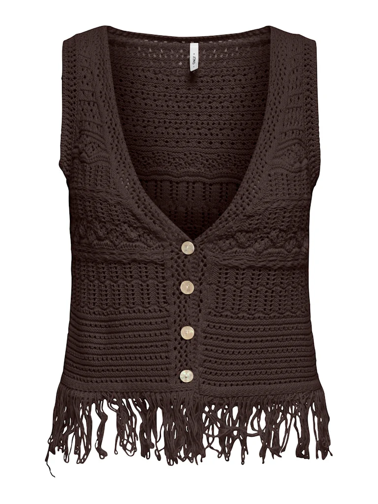 Met deze stijlvolle bruine gilet van Only ben jij klaar voor iedere gelegenheid. De gilet is gemaakt van een mix van katoen en polyester, wat zorgt voor een comfortabele pasvorm en duurzame kwaliteit. Het lichte materiaal maakt deze gilet perfect voor zowel binnen als buiten. Of je nu een formele look wilt creëren of juist gaat voor een casual outfit, met deze gilet kun je alle kanten op. Combineer met een blouse en pantalon voor een zakelijke look, of draag het over een T-shirt en jeans voor een trendy uitstraling. Laat jouw persoonlijkheid stralen met de gilet dames van Only, verkrijgbaar bij NummerZestien.