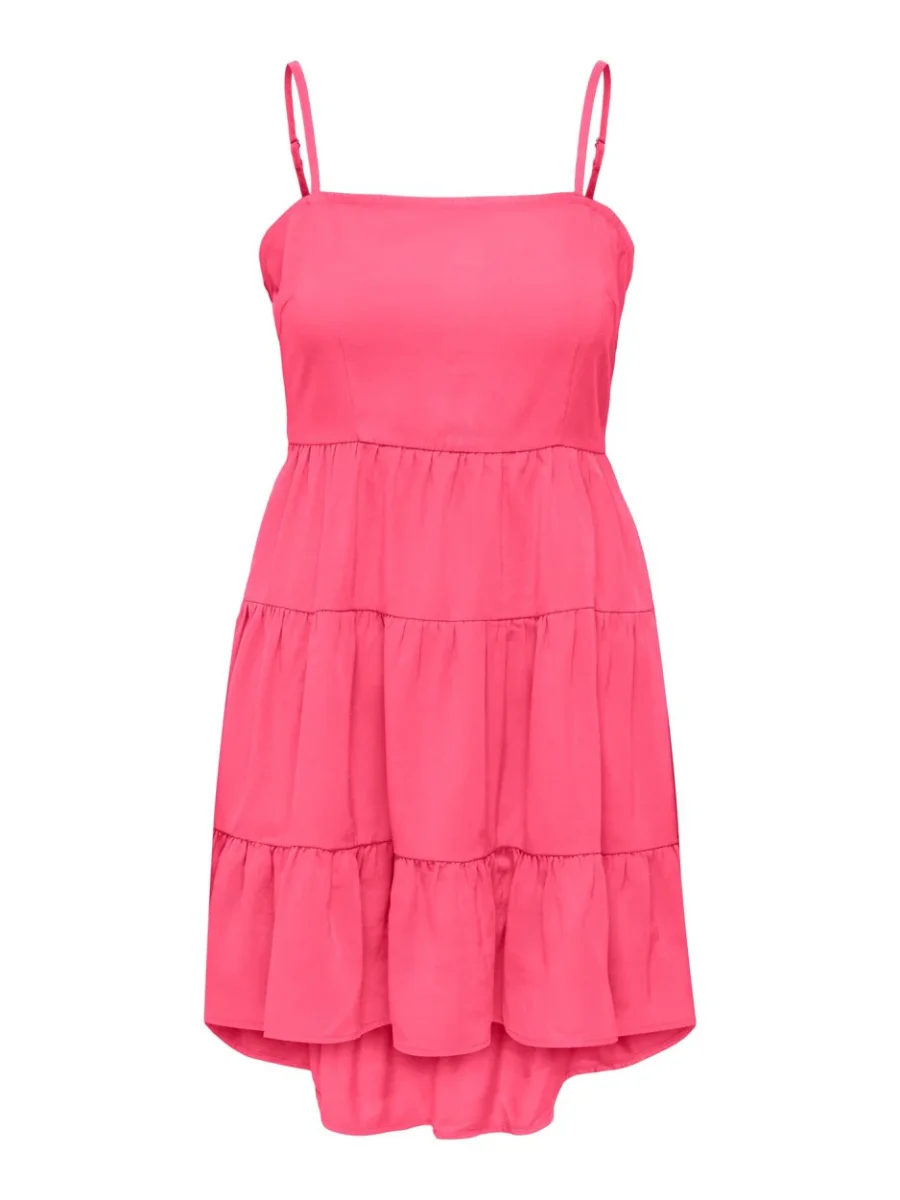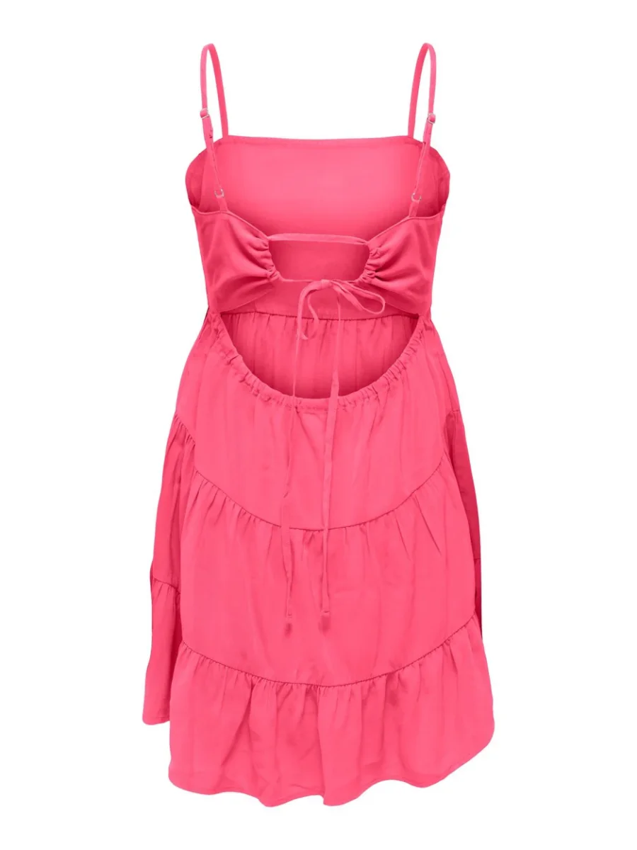 De roze Only Aris jurk is een must-have voor elke modieuze vrouw. Deze korte jurk heeft een flatterende vierkante hals en is mouwloos, waardoor het perfect is voor de warmere seizoenen. De verstelbare spaghetti bandjes zorgen ervoor dat de jurk altijd perfect past bij jouw lichaam. Het open rug detail geeft een speelse twist aan de jurk en maakt het een echte eyecatcher.