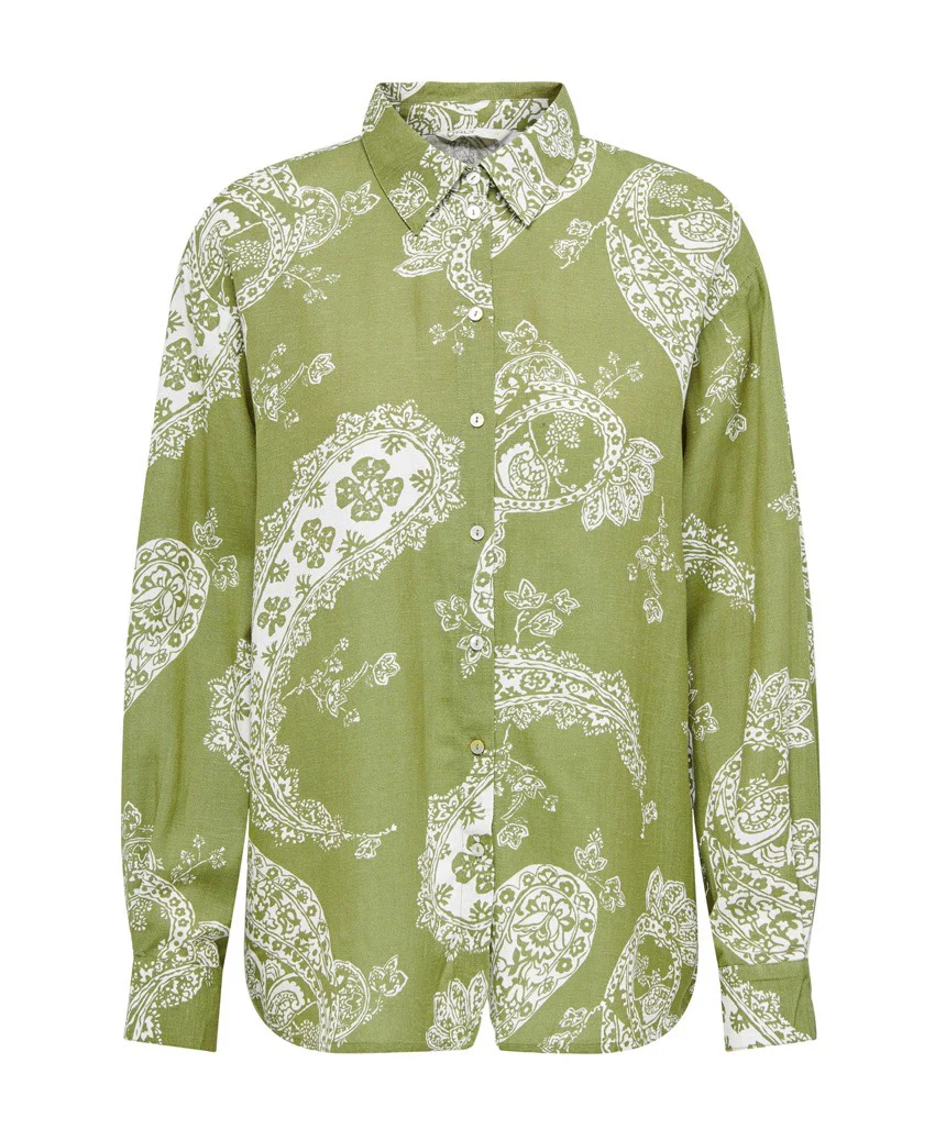 Deze prachtige Only blouse in groen dessin is een must-have voor iedere trendy dame. De blouse heeft lange mouwen, een kraag en een knoopsluiting aan de voorzijde voor een elegante uitstraling. Het oversized model is voorzien van een opvallende allover paisley print die direct in het oog springt. Deze blouse geeft jouw outfit direct een speelse en modieuze twist.