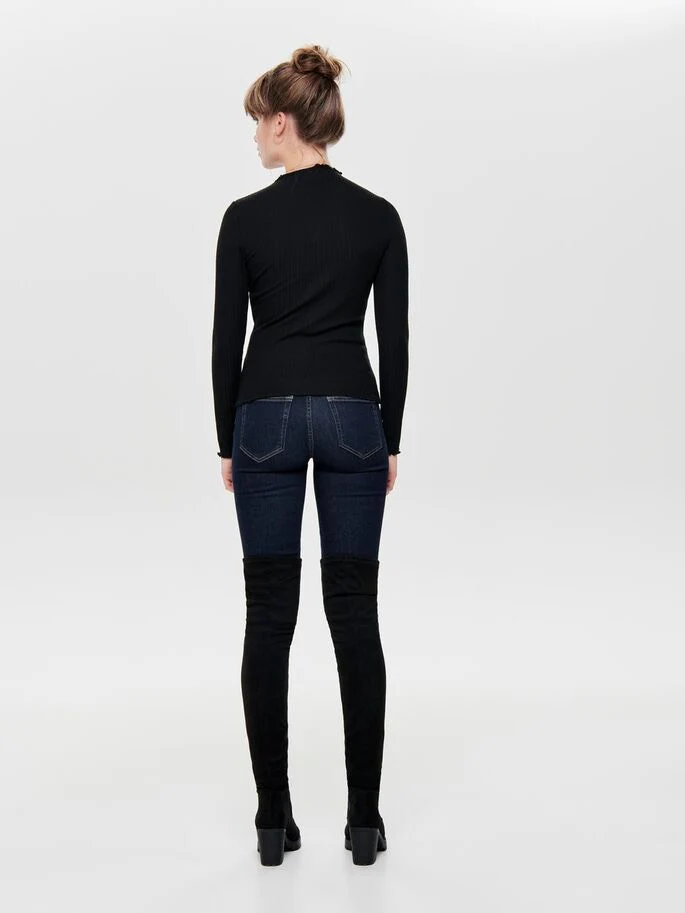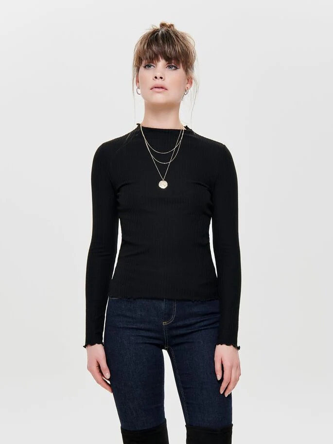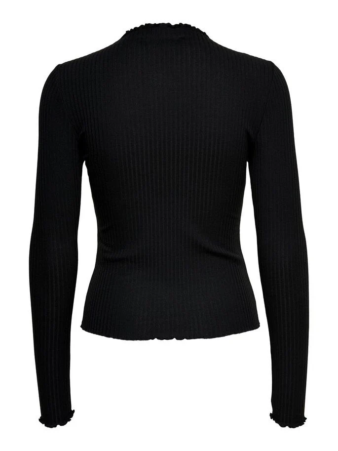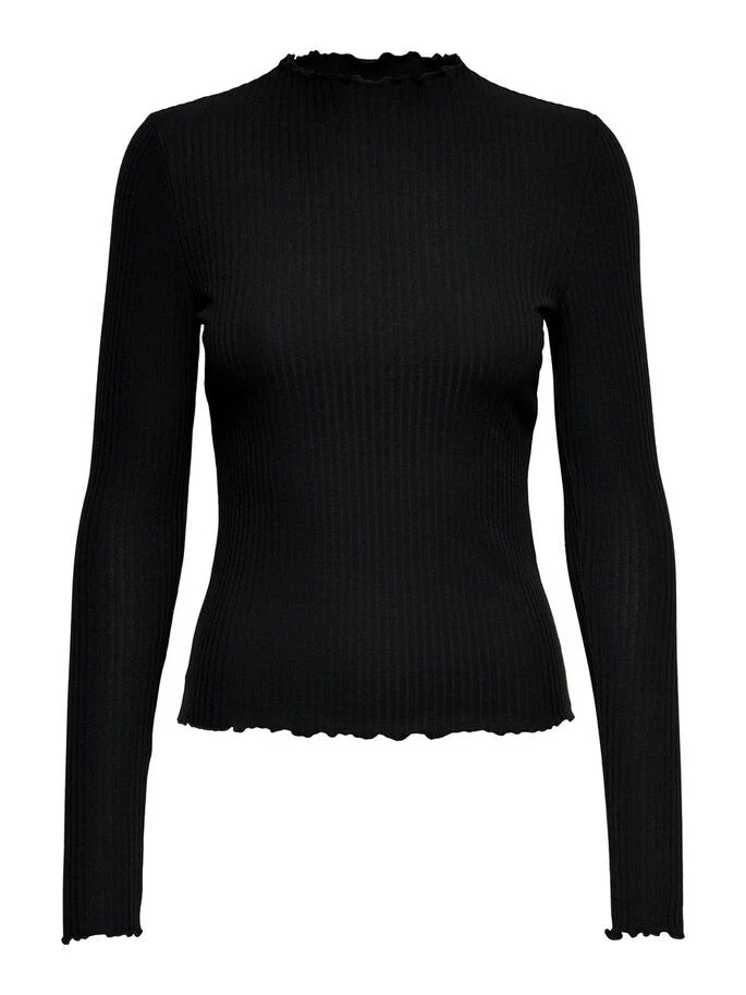 Dit zwarte t-shirt met lange mouwen voor dames van het merk Only is een must-have item voor elke vrouwelijke kledingkast. De top is gemaakt van een ribstof en heeft een stretchy pasvorm, waardoor het comfortabel en vrouwelijk draagt. De iets hogere kraag voegt een stijlvolle touch toe aan het geheel.