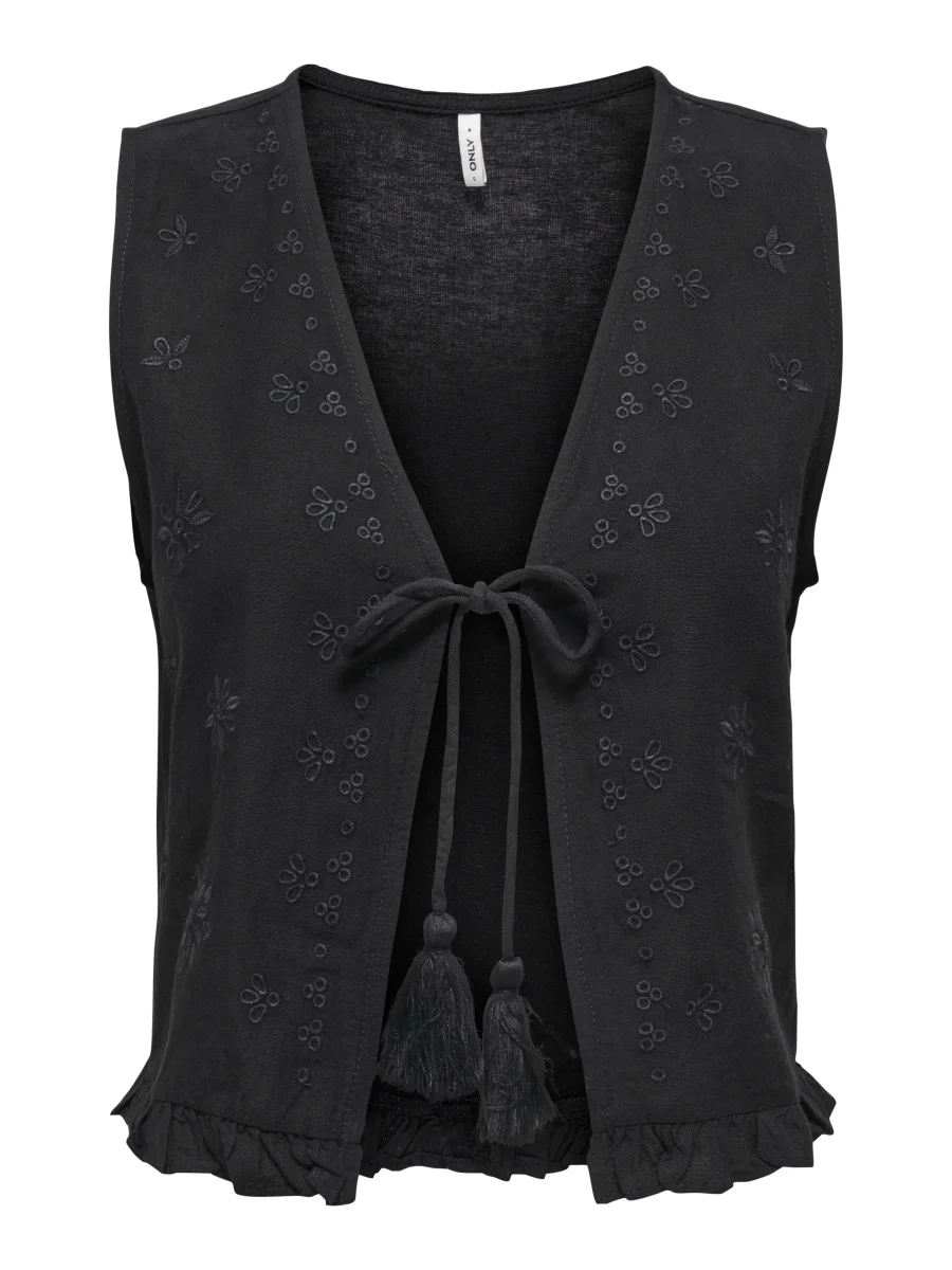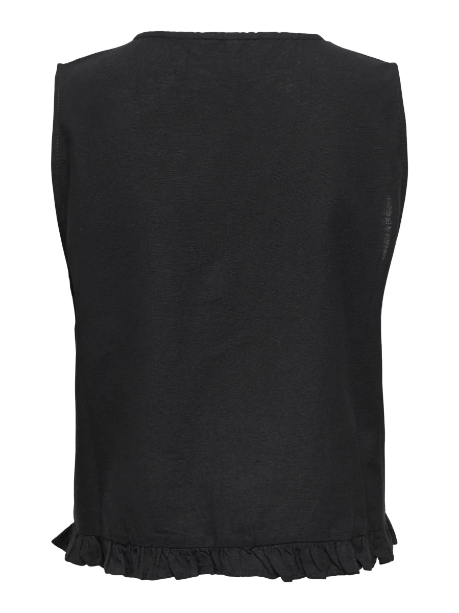 Deze zwarte gilet voor dames van het merk Only is een tijdloos en veelzijdig kledingstuk dat niet in je kledingkast mag ontbreken. Deze gilet is perfect voor zowel formele als casual gelegenheden en kan op verschillende manieren gestyled worden. Het is gemaakt van een comfortabele mix van viscose, katoen en linnen, waardoor het zacht aanvoelt en tegelijkertijd ademend is. De gilet heeft een klassiek design met een open voorkant en twee steekzakken aan de zijkant. De zwarte kleur zorgt voor een stijlvolle en tijdloze uitstraling. Draag deze gilet over een blouse of top voor een formele look, of combineer het met een T-shirt en jeans voor een casual outfit. Upgrade je kledingkast met deze prachtige zwarte gilet van Only en creëer eindeloos veel verschillende looks!