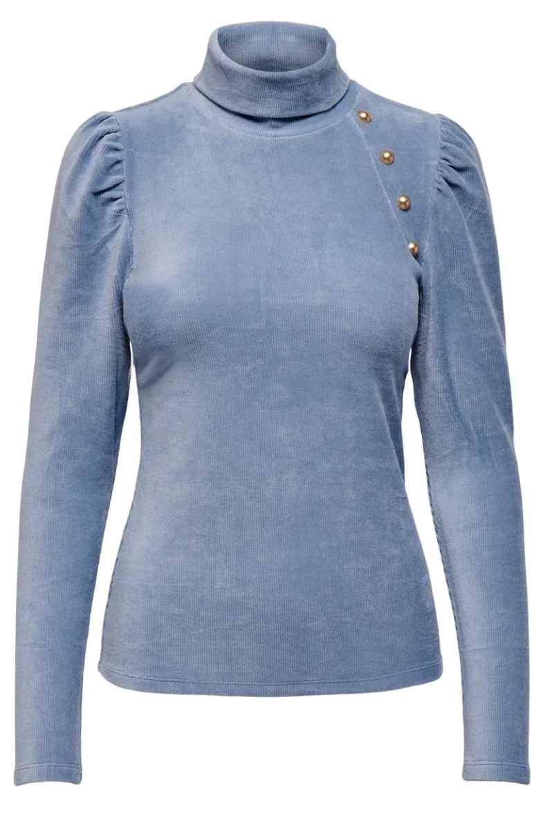 Deze blauw melee top van Only is een must-have item voor elke stijlvolle dame. De top is voorzien van een warme col en is gemaakt van ribgebreid materiaal. De gouden studs op de schouder geven een luxe touch aan deze mooie top.