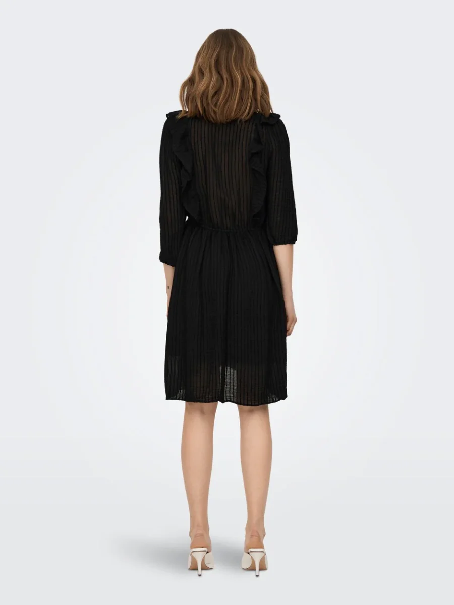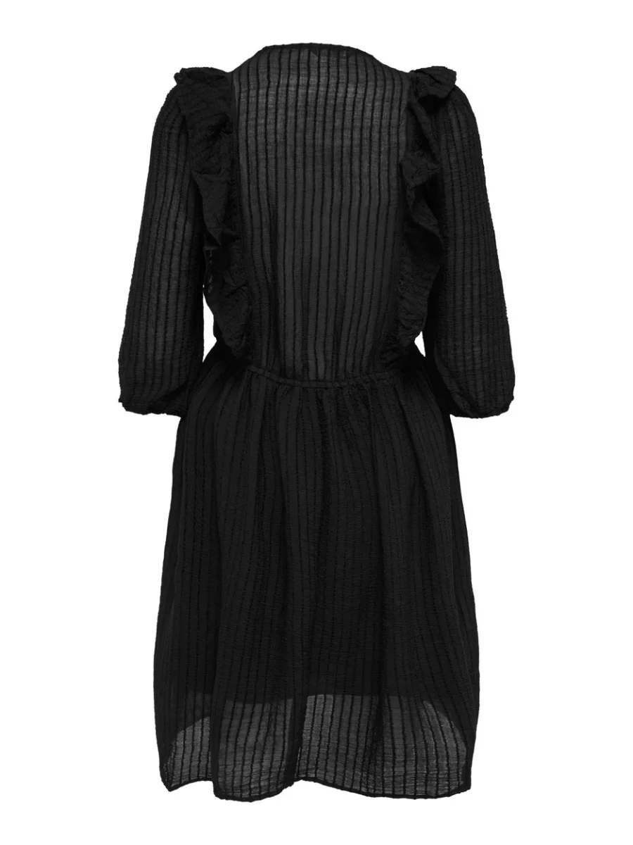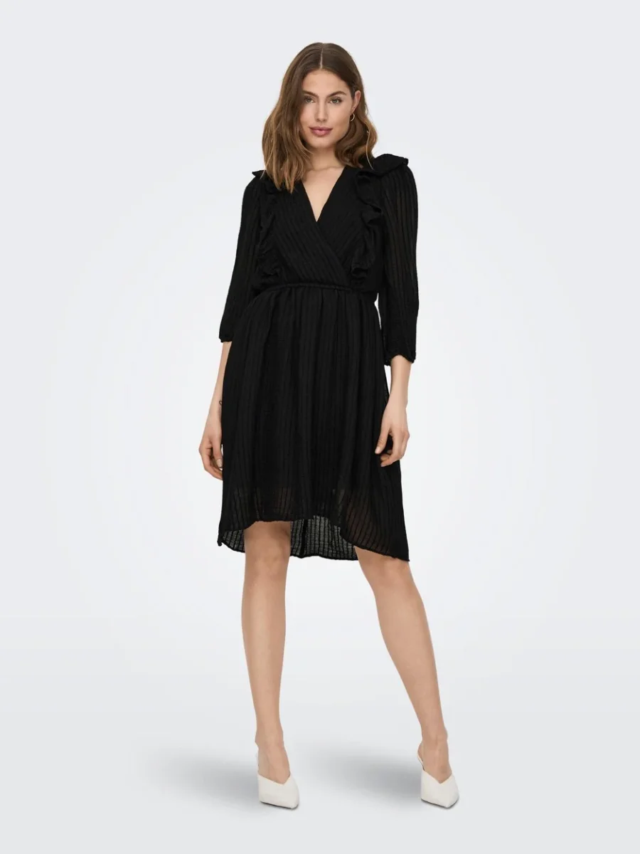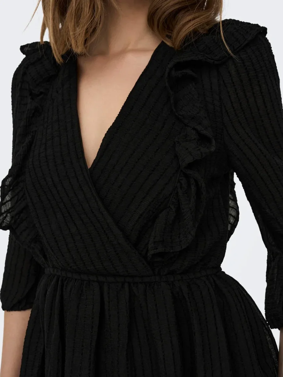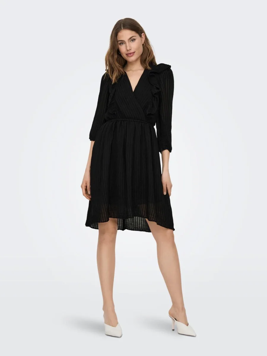 Op zoek naar een stijlvolle en trendy jurk die je zowel casual als chic kunt dragen? Dan is deze zwarte korte damesjurk van het merk Only perfect voor jou. De jurk heeft een flatterende overslag V-hals, die je vrouwelijke vormen mooi laat uitkomen. Daarnaast is de jurk voorzien van 3/4 pofmouwen en sierlijke ruffles aan zowel de voor- als achterkant, voor een speels effect.