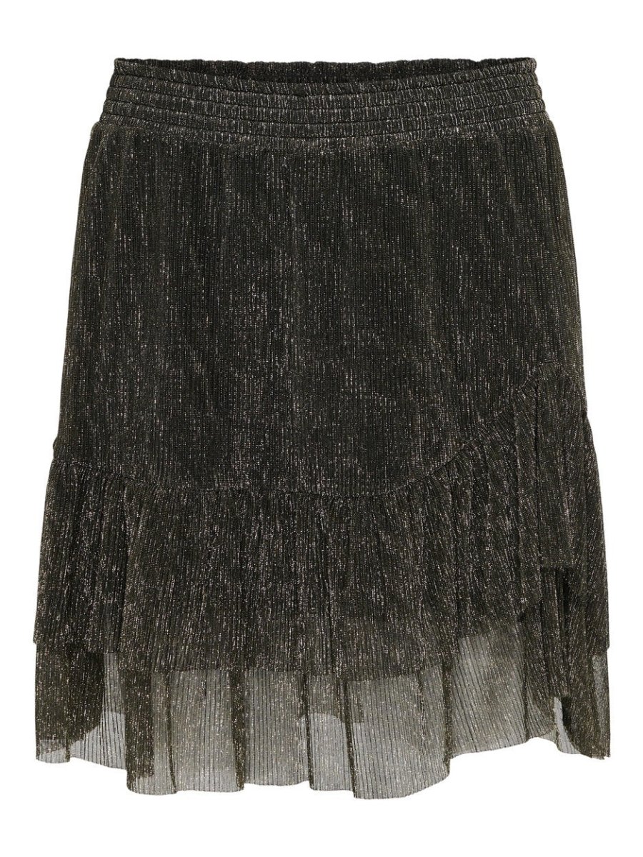 Deze betoverende korte rok van het merk ONLY is een echte eyecatcher in de garderobe van elke fashionista. De goudkleurige stof is voorzien van een subtiel glitter lurex draadje, waardoor je straalt als een echte ster. De rok is gemaakt van 100% polyester en voelt daardoor heerlijk licht en soepel aan op de huid.