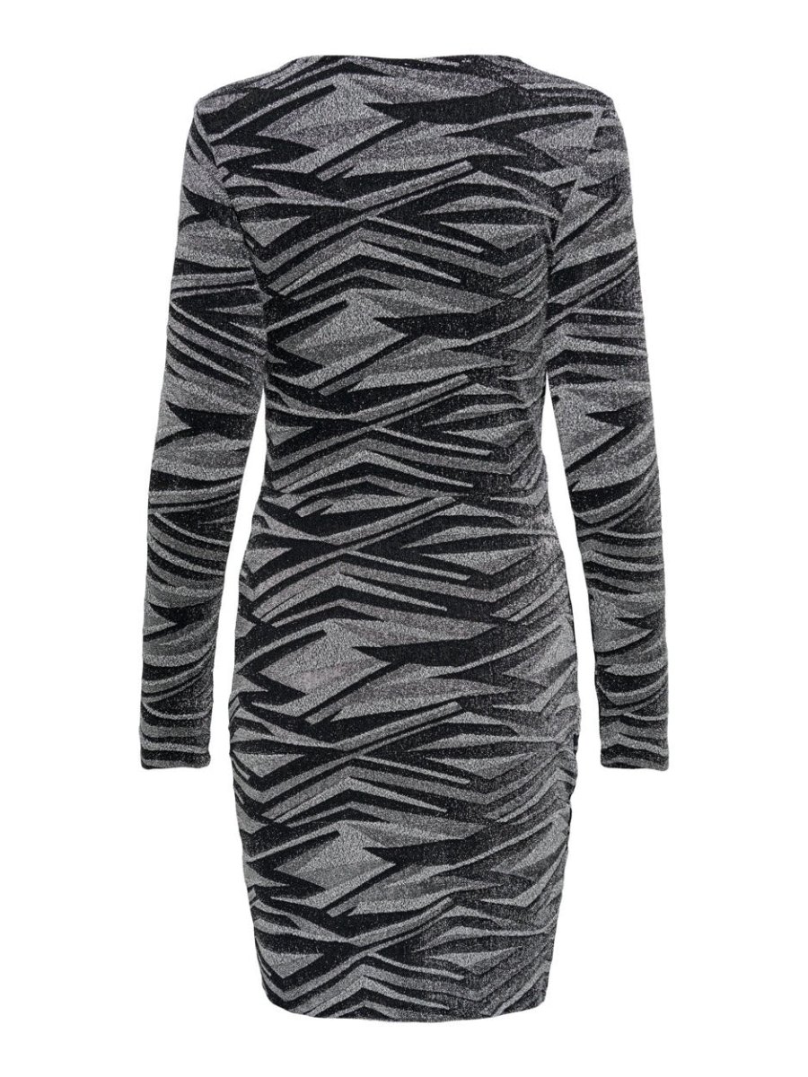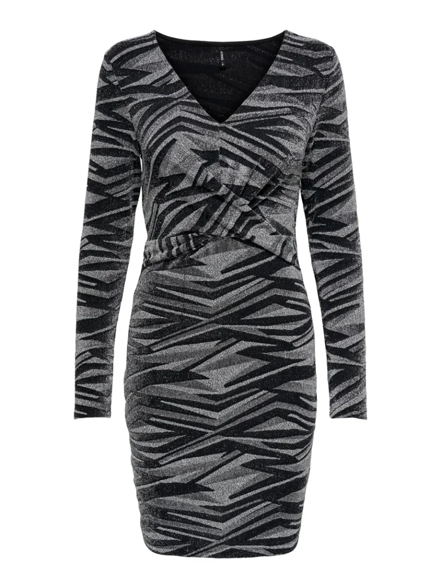 De jurk heeft een prachtige V-hals en een gedraaid detail aan de voorkant, wat zorgt voor een speels effect. Door de glanzende stof en het zilverkleurige dessin, zal deze jurk zeker alle ogen op jou gericht laten zijn tijdens jouw volgende feestje.