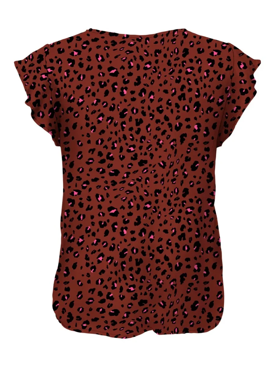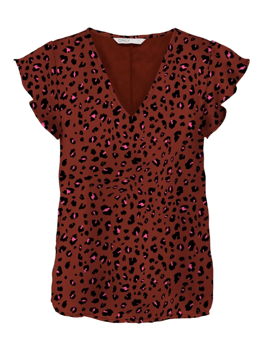 Deze prachtige rode top van het bekende merk Only is een absolute must-have voor elke damesgarderobe! De top is voorzien van een opvallend dessin met een mix van verschillende tinten rood, wat zorgt voor een speels en trendy effect. De korte mouwen hebben een elegant gevlinderd design en de ronde hals geeft de top een vrouwelijke touch.
