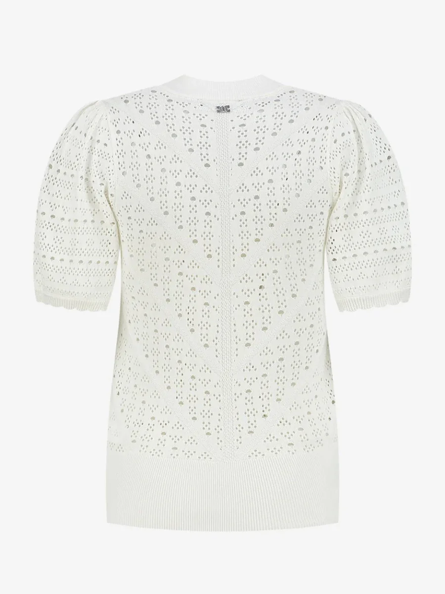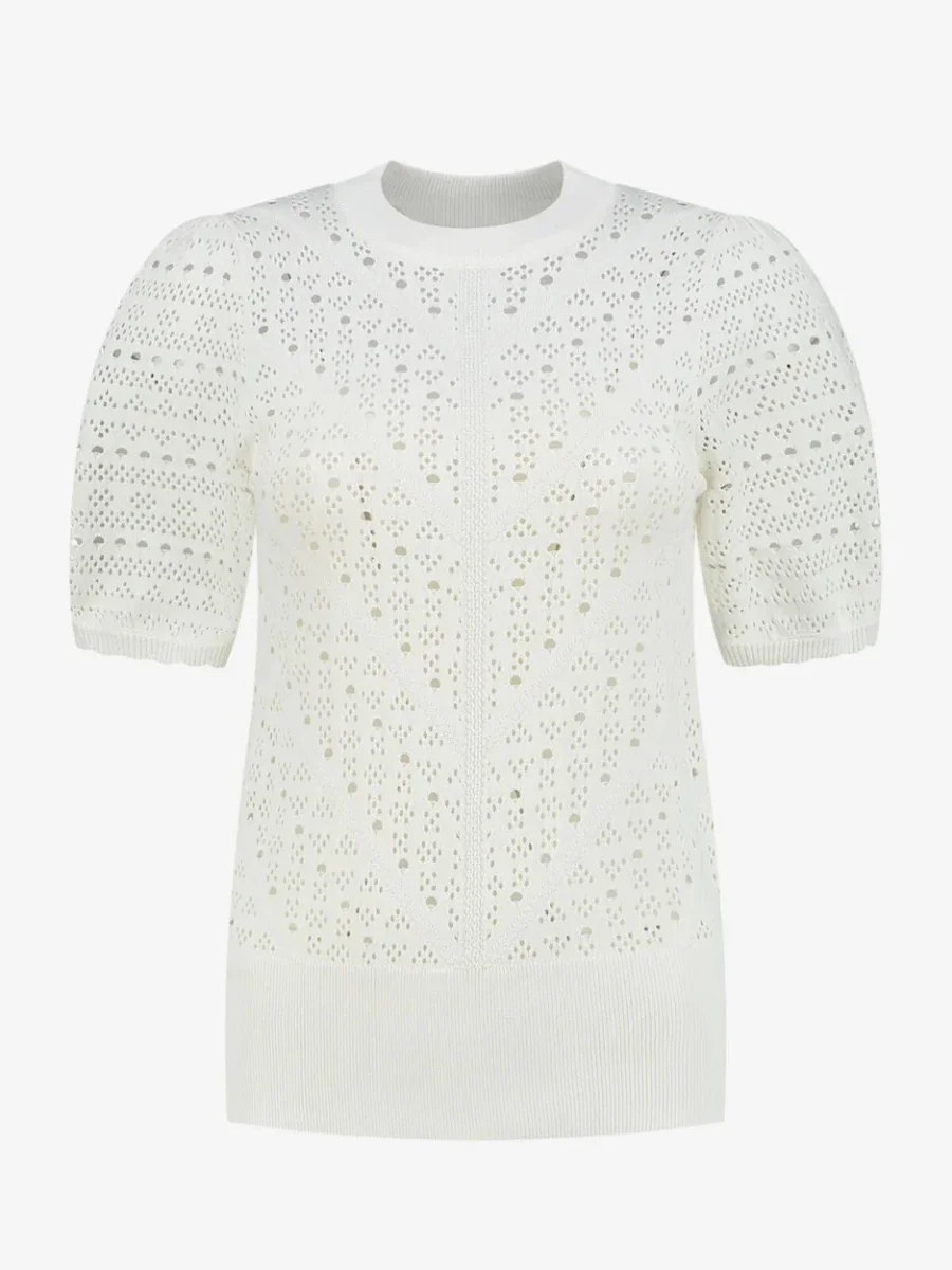 Deze stijlvolle Nikkie Phadi top is perfect voor elke gelegenheid. De klassieke witte kleur zorgt voor een tijdloze uitstraling en combineert moeiteloos met elke outfit. Deze top is dun gebreid met opengewerkte details, wat zorgt voor een luchtige look. Het heeft korte mouwen en een ronde hals, wat zorgt voor een comfortabele pasvorm. Op de schouders zijn er kleine plooien aangebracht, waardoor er een speelse pofmouw ontstaat. Deze details geven de top een uniek en modieus tintje.