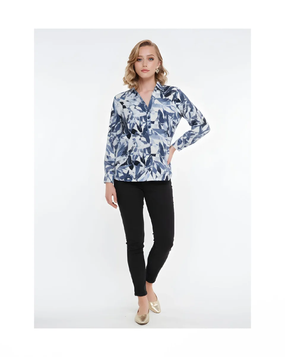 Dit polo shirt met 3/4 mouwen is uitgevoerd in frisse voorjaarskleuren met een stijlvol bladerenmotief. De zachte stof en het fijne draagcomfort maken dit shirt ideaal voor dagelijks gebruik. De knoopsluiting en kleine splitjes zorgen voor een verzorgde, vrouwelijke uitstraling.