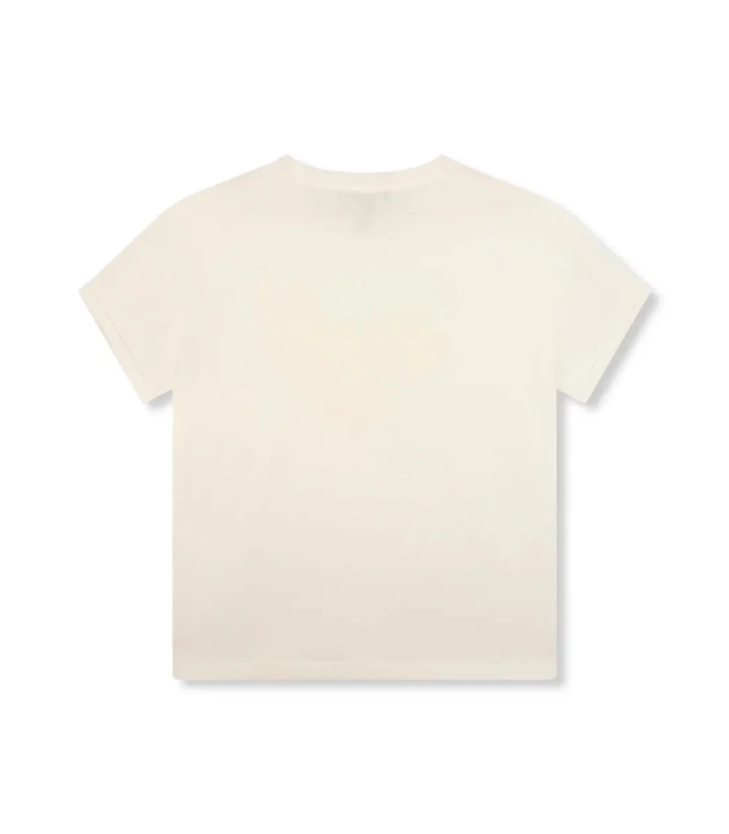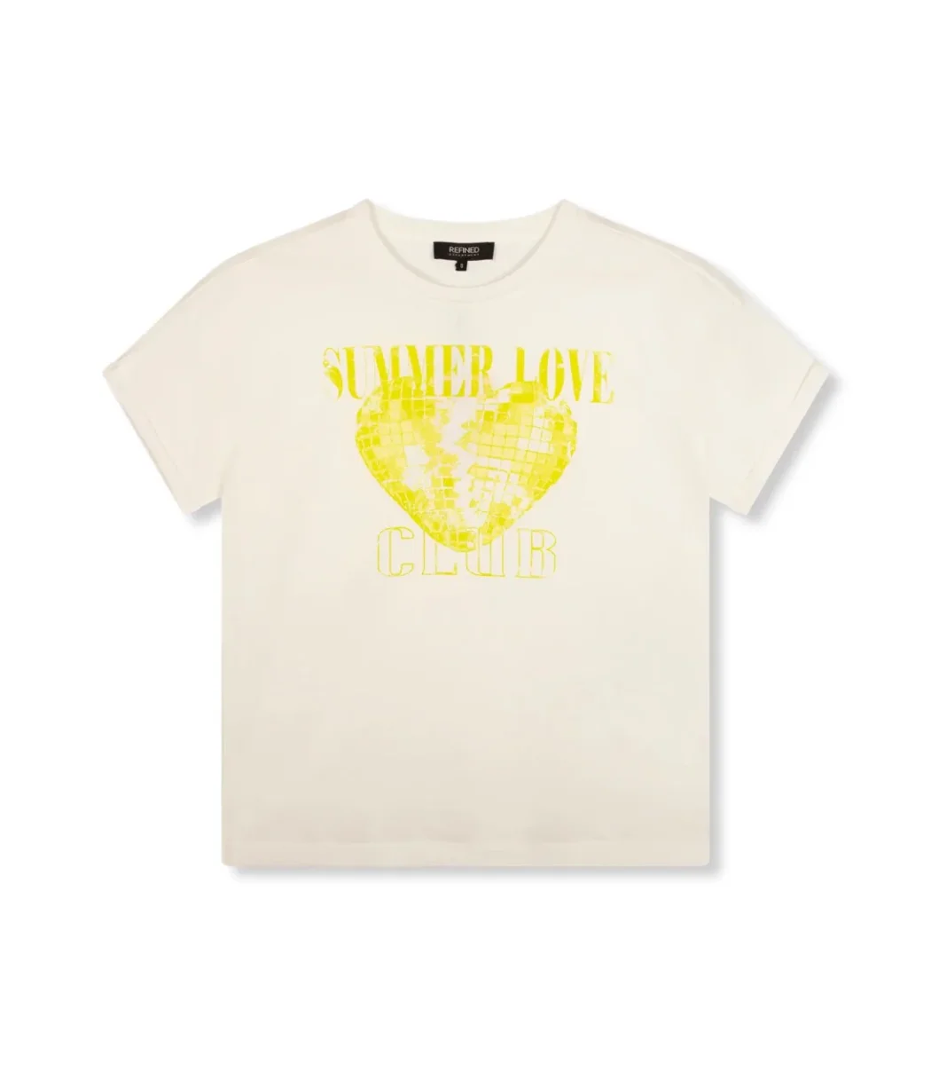 Dit off-white t-shirt voor dames van het merk Refined Department is een absolute must-have voor de zomer. Het shirt heeft een ronde hals met een ribboord en korte mouwen met een vast omslag randje, wat zorgt voor een speelse en vrouwelijke touch. Het shirt is gemaakt van 100% katoen, wat zorgt voor een comfortabele en ademende pasvorm.