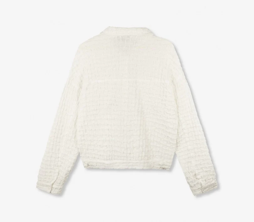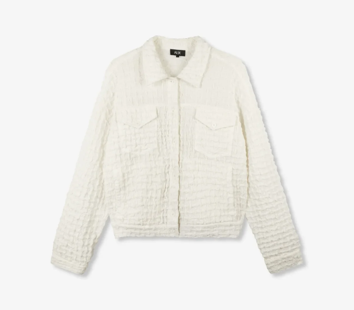 Ga voor een stralende, frisse look met deze prachtige off-white jack dames van het bekende merk alix the label. Deze jas is gemaakt van een seersucker geruite stof en heeft een licht transparante uitstraling. De perfecte combinatie van stijl en comfort! De lange mouwen, kraagje en borstzakken met knoopsluiting geven de jas een klassieke touch. Een must-have voor elke moderne vrouw.