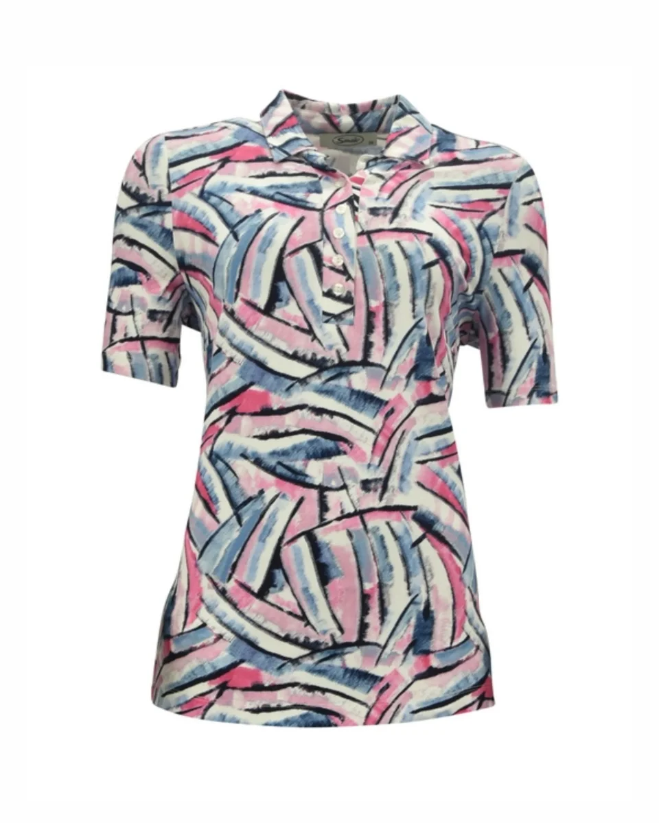 Dit poloshirt van het merk Sensia Fashion heeft een tijdloze uitstraling met een ruime polokraag en knoopsluiting. Het rechte model is afgewerkt met korte splitjes in de zijnaden en korte mouwen voor een prettige pasvorm. De soepele jersey kwaliteit zorgt voor comfortabel dragen, terwijl het bloemen dessin in fuchsia, oranje en groen tinten het shirt makkelijk te combineren maakt.